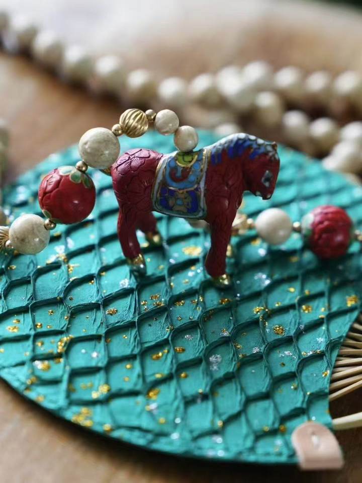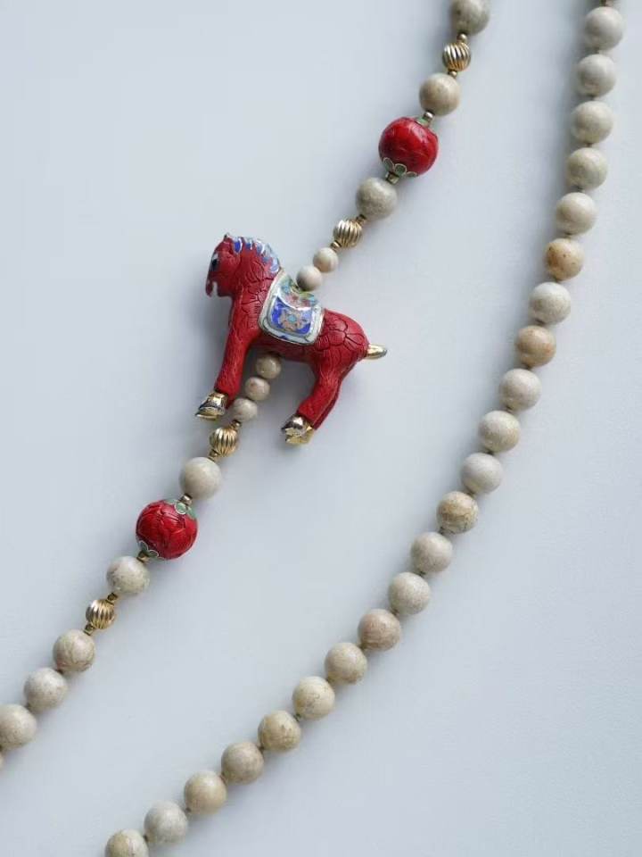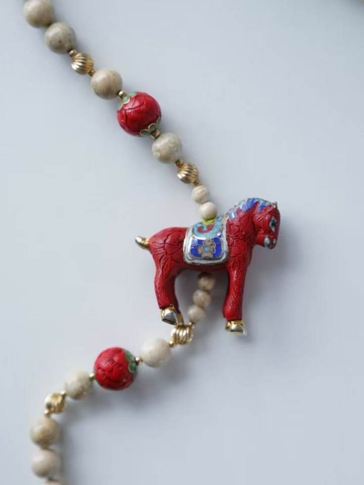 她小心地让摊主拿出来,刚戴到脖子上就转头问:“妈,好不好看?会不会太艳了?”妈妈凑过来打量,仔细打量了一番链子:“这朱砂红得正,景泰蓝的边又衬得皮肤白,配你今天的衣服刚好,一点不艳。”