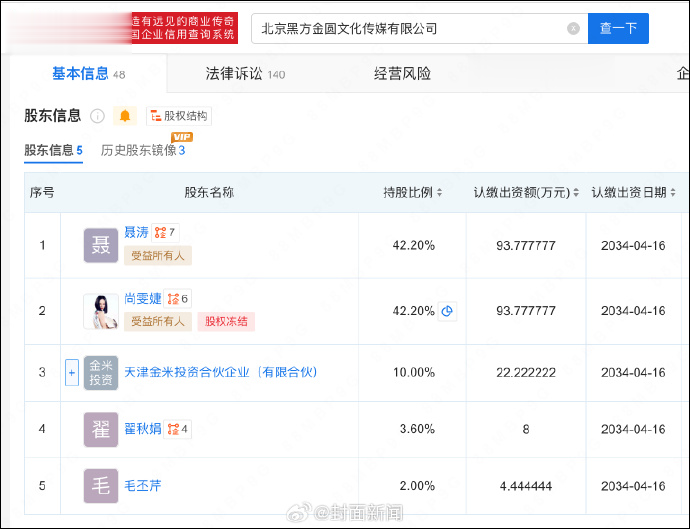 10月20日,媒体报道尚雯婕主页已显示其MCN为papi酱(姜逸磊)创立的papitube。此外查询企查查信息发现,近日,尚雯婕被冻结超93万元股权,被冻结标的企业为北京黑方金圆文化传媒有限公司,执行法院为北京市朝阳区人民法院。据悉,北京黑方金圆文化传媒有限公司为黑金经纪关联公司,成立于2014年4月,尚雯婕持股42.2%。