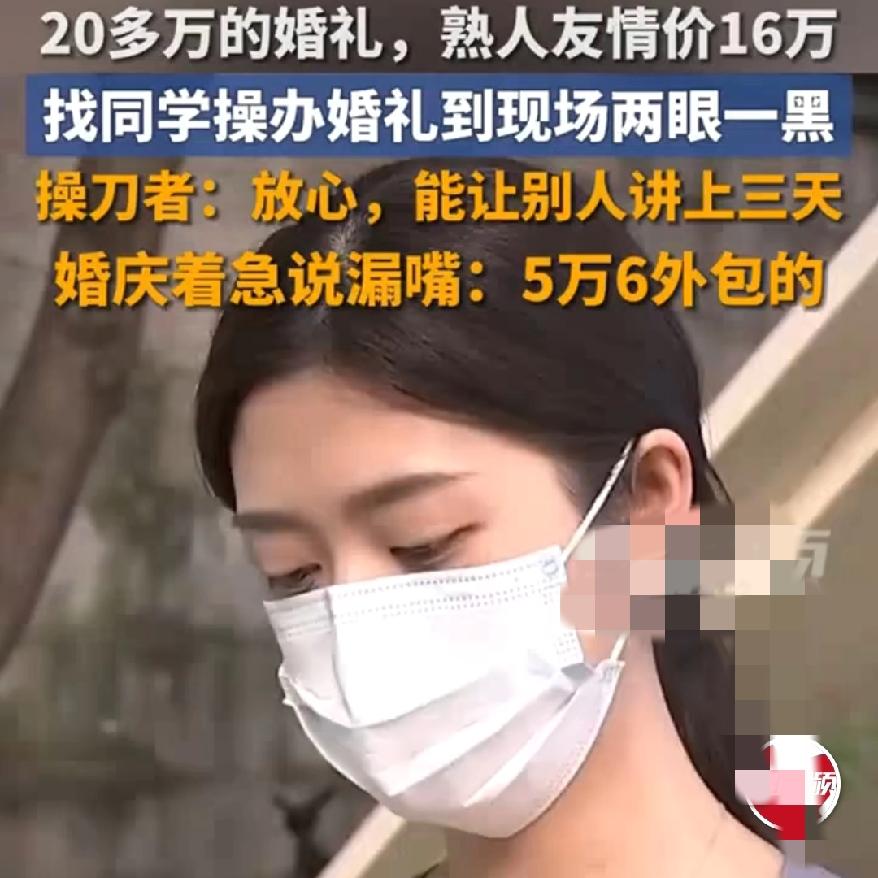 同学的“友情价”, 是宰熟最狠的“刀”! 16万找同学办婚礼,本以为捡了“20万效果”的便宜,结果到现场直接两眼发黑——褪色的假花、漏水的喷泉,跟村口戏台子没两样。 更恶心的是,婚庆随口说漏嘴,这活儿5万6就外包了,同学动动嘴就赚10万差价。当初拍着胸脯说“让全村讲三天”,确实做到了,只不过全是嘲讽。 其实她难过的不是钱,是那份信任崩塌的感觉。因为是熟人,甚至连合同都没签,提前打了10万预付款,最后维权都没凭据。 你们有遇到熟人揽活,该怎么拒绝才不伤面子?同学骗局 婚庆