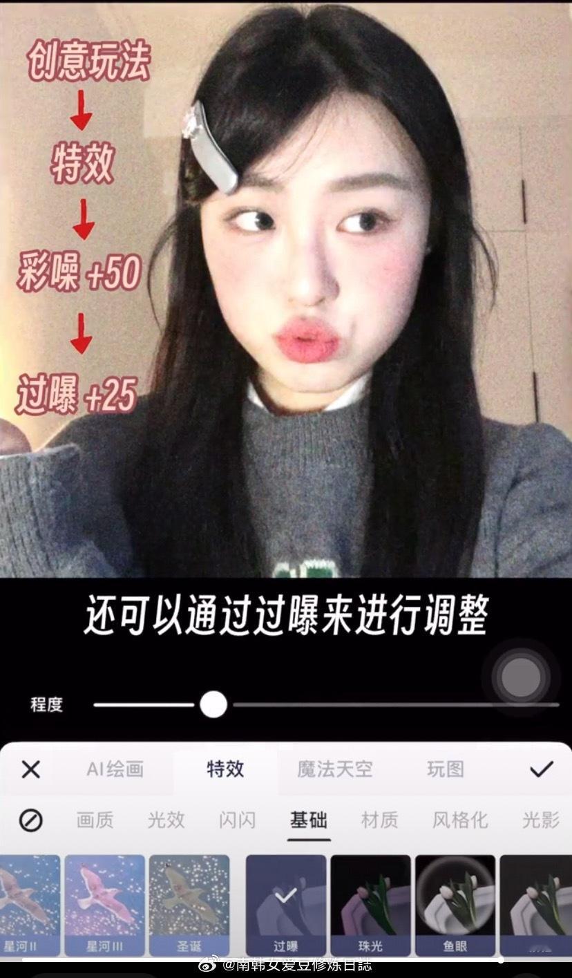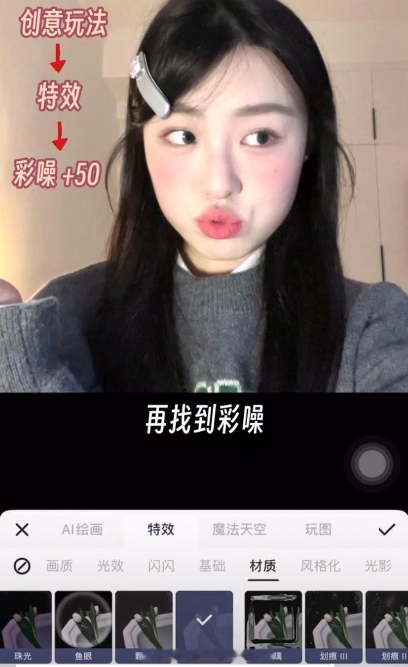 然后打开mtxx 创意玩法→特效→彩噪➕50→过曝➕25