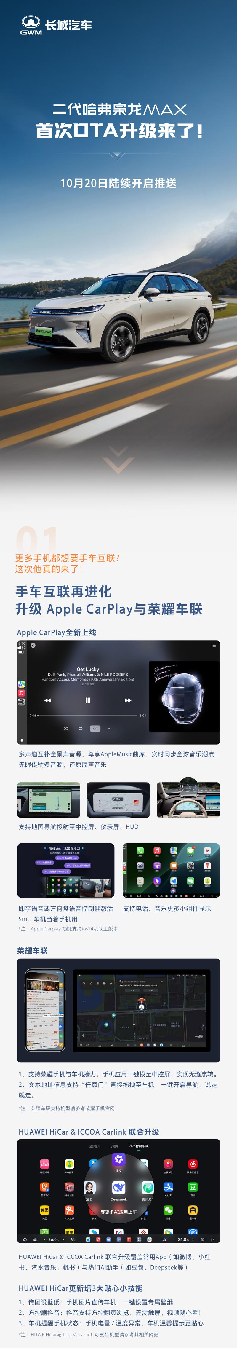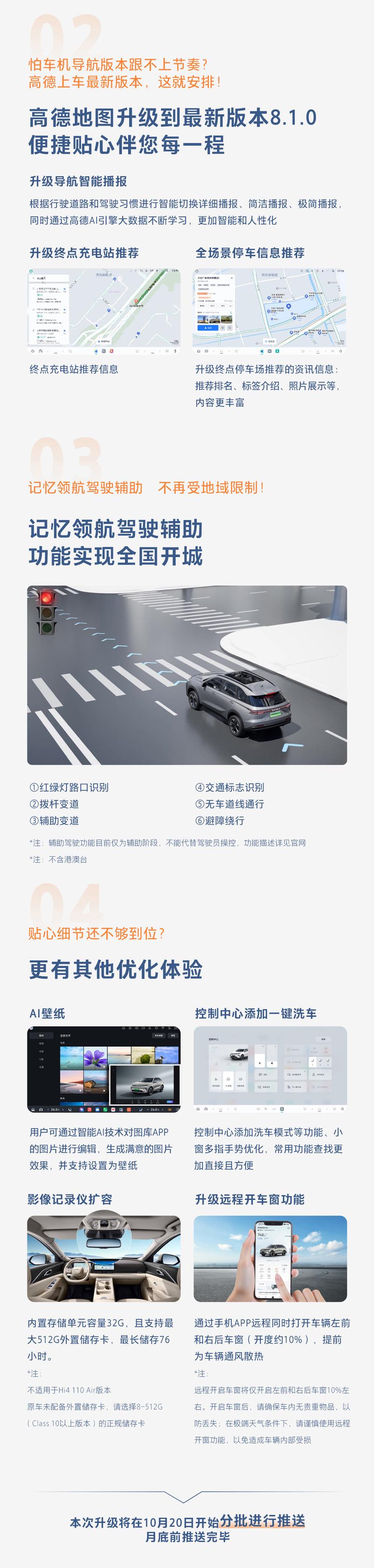 车机方面,AppleCarPlay全新上线、荣耀车联可将手机应用一键投至中控屏、HUAWEIHiCarICCOACarlink联合升级;导航方面,高德地图升级到最新版本8.1.0;记忆领航驾驶辅助方面,不再受地域限制,实现全国开城。本次升级将在10月20日开始分批进行推送,月底前推送完毕。