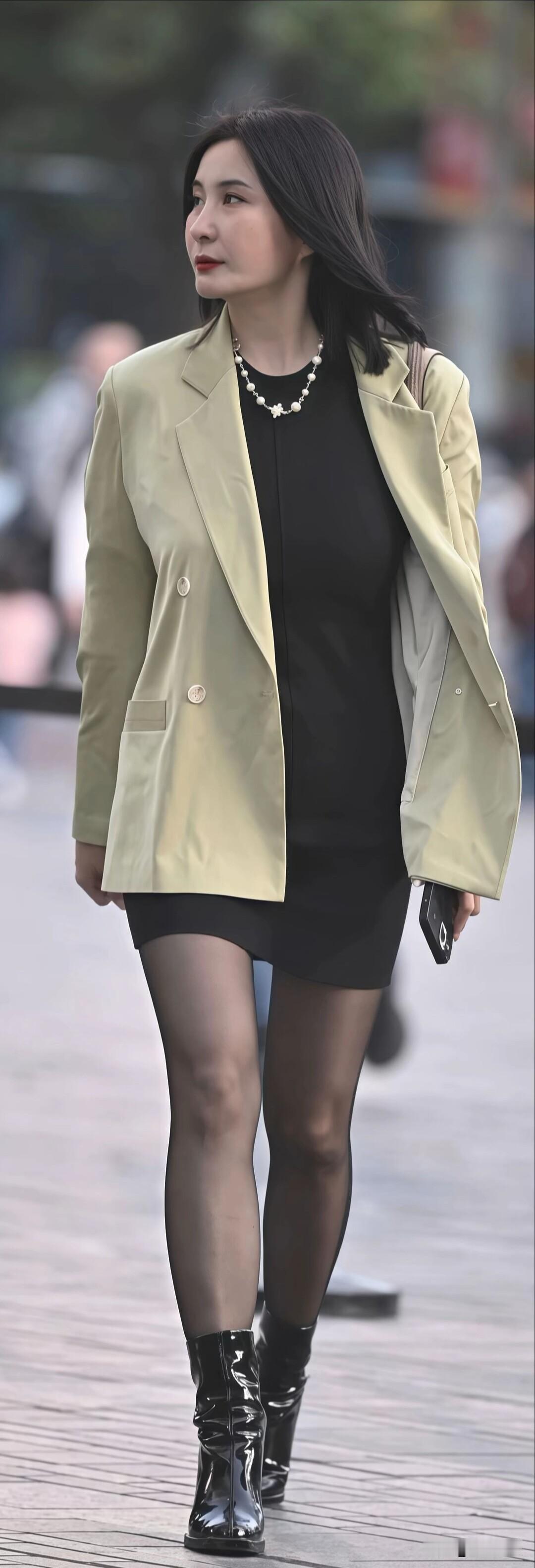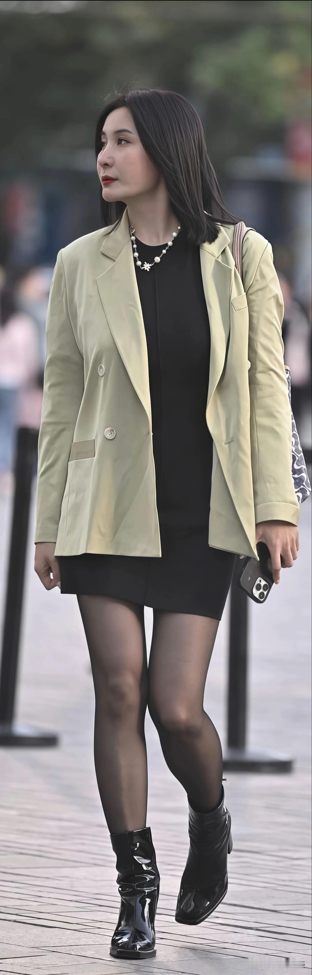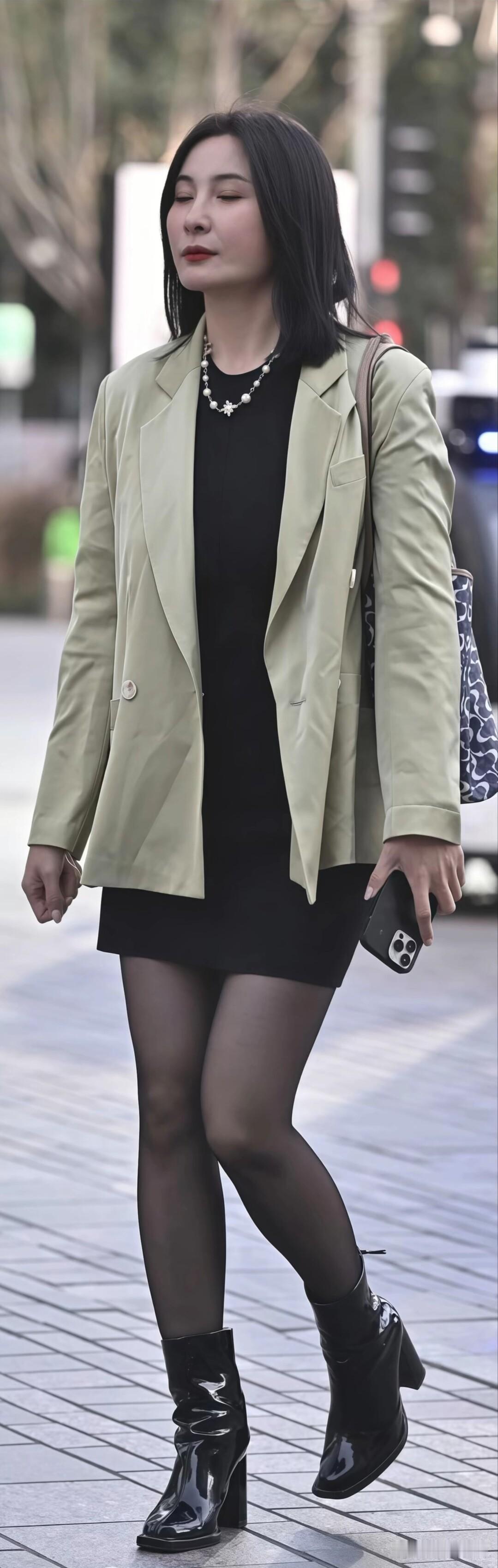 浅绿西装搭黑色短裙,配亮面短靴,日常这么穿,上班逛街都合适。