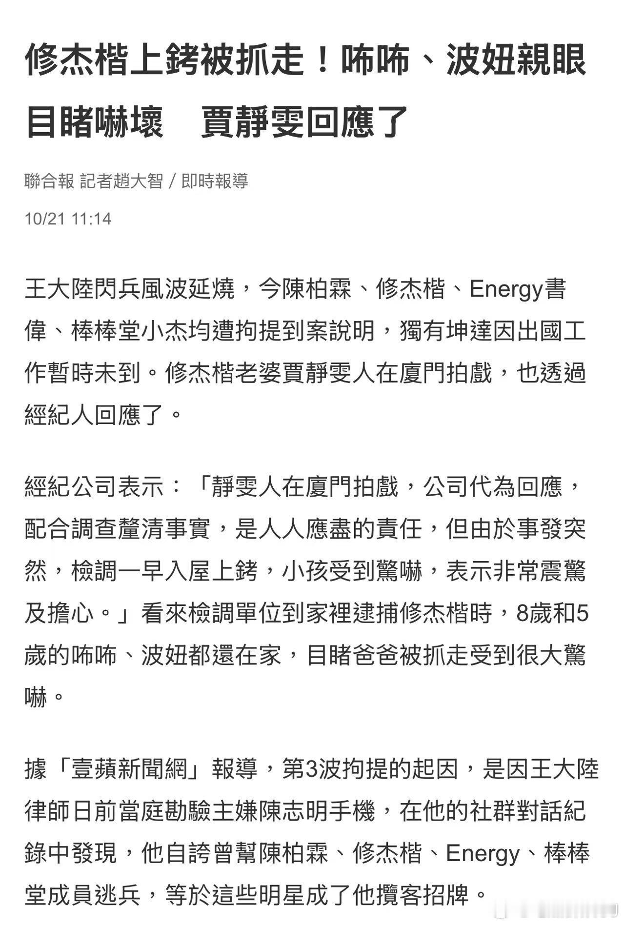 修杰楷被警方戴上手铐带走的时候,贾静雯人在厦门拍戏,并没有在家,但啵妞和咘咘两个小朋友是亲眼看到爸爸被上铐抓走的,为此受到了很大惊吓。