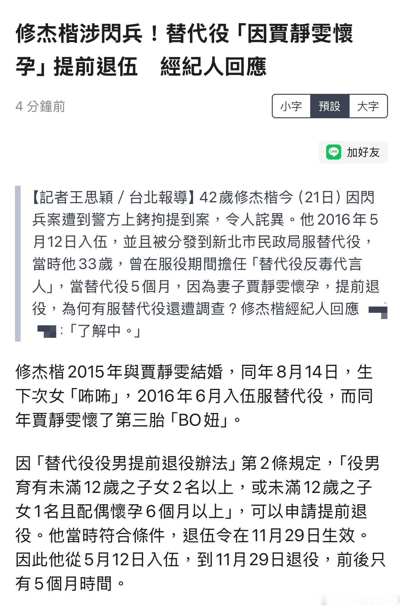 他是想过逃兵役,也花了15万新台币假装成高血压,但高血压最多只能转服替代役不能免入伍,修杰楷本来打算继续花钱来躲,后来又转念去服了替代役,只是才当兵五个月就因为贾静雯怀孕申请了合规的提前退伍。