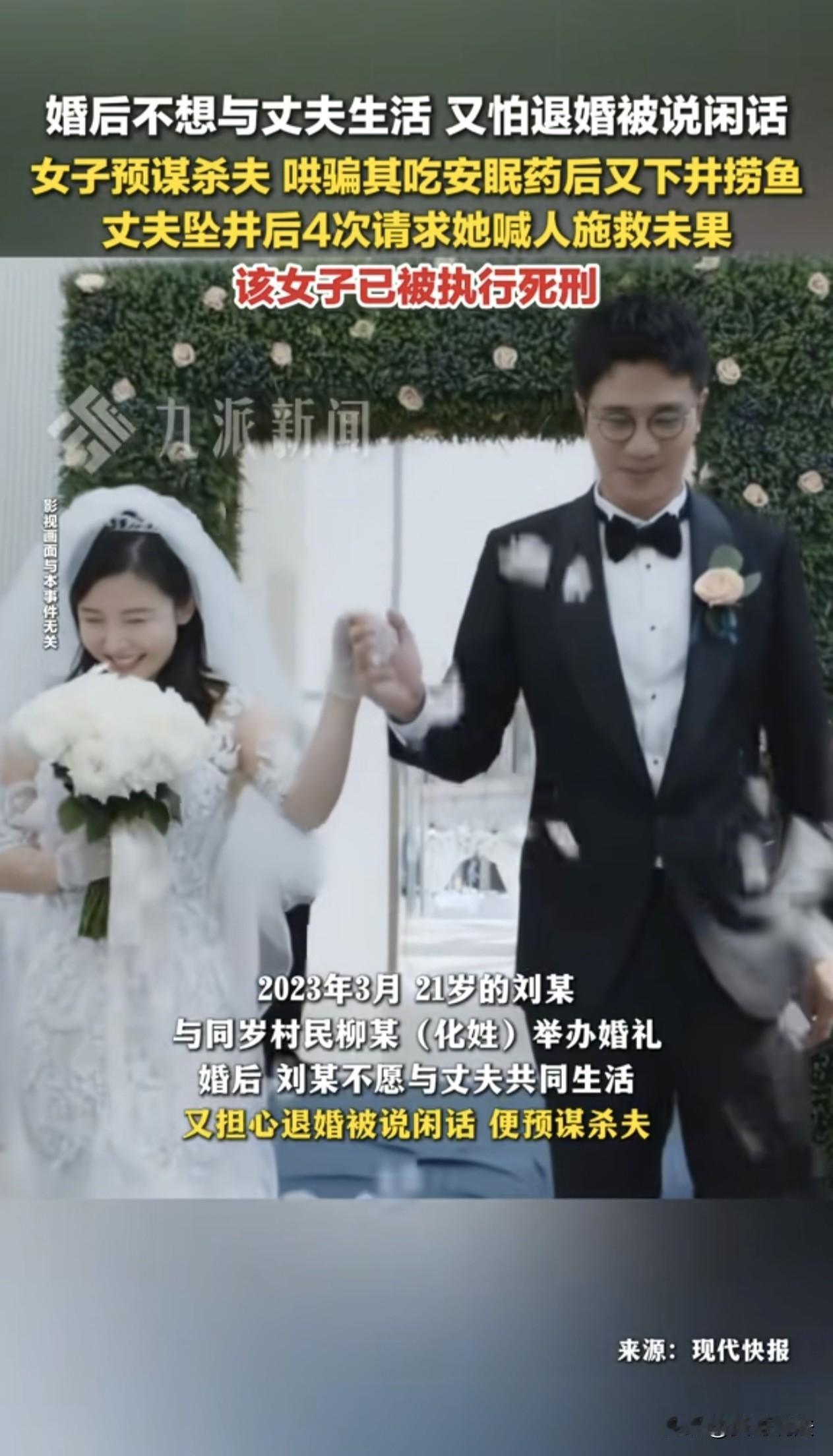 太狠了!山东菏泽,女子才和丈夫才结婚两个月,便有了退婚的想法,但害怕村里说闲话,女子竟产生了杀害丈夫的念头。于是,她买来安眠药哄骗丈夫吃下,最后将诱导丈夫坠入井中窒息死亡。 都说“百年修得同船渡,千年修得共枕眠!” 两人能最终走到一起是缘分更是福分,彼此之间应互相尊重,相互珍惜才对。 退一步来讲,即便中途缘分散尽,也更应好聚好散。 然而,山东菏泽一女子的做法却是截然相反,甚至让人有些看不懂。 据九派新闻10月21日报道,21岁的女子刘某和同岁的男子柳先生在2023年举办婚礼。 婚后仅过两个月,不知为何,刘某就同柳先生过不下去了。 刘某也想过和柳先生进行离婚,但考虑到此事会对自己和父母的名声有影响,进而遭到村里人的嘲笑。 刘某索性直接想出了杀害柳先生进而解决问题的方式。 事发当天,刘某早早从药店买来一盒复方地西泮片。 在柳先生从父母家喝完酒后,刘某又以这是解酒药为由哄骗他喝掉。 随后,刘某带着柳先生来到机井旁,通过推搡、诱导等方式让柳先生下井,在柳州 柳先生在井中拼命呼救,但刘某仍不管不顾,还盖上了井盖,随即扬长而去。 最终,柳先生因缺氧窒息死亡。 刘某在事发后被抓获归案。 对此,网友纷纷谴责刘某的如此作为,觉得她实在蛇蝎心肠! “这个女人太狠毒了,不喜欢丈夫可以离婚,何必下那么狠手把人杀死呢?” “就因为怕说闲话就要杀人,刘某的脑子是怎么想的?” “不想一起生活,也有别的办法呀,那你可以出去打工呀,不回家也是一种方式,为什么一定要把人害死呢?这有多么的深仇大恨呀,才一共结婚两个多月,真不知道这女的当时是咋想的,一定要至对方为死地,也不想想你自己杀的人能跑的了吗?” 诚然,柳先生对刘某如此信任,却遭到对方哄骗,最终被残忍杀害在井中,刘某的行为实在让人发指,她也必将要付出应有的代价。 《刑法》规定,犯故意杀人的,处死刑、无期徒刑或10年以上有期徒刑。 刘某就因和柳先生生活过不下去了,就采取投药且诱骗柳先生下井的方式将其残忍杀害。 刘某的行为已经构成故意杀人罪。 在具体量刑上,刘某犯罪动机卑劣,情节恶劣,后果严重,造成不良社会影响。 法院据此以故意杀人罪判处刘某死刑。 刘某不服,上诉,二审维持原判。 2025年9月26日,经最高院核准,刘某死刑已被执行。 总而言之,对于夫妻而言,在婚姻中有矛盾,矛盾再激烈,也总有沟通、分开等理性解决方式。 选择杀人不仅彻底断送了所有退路,还会让两个家庭陷入悲剧,这种极端行为既无法解决问题,更要付出法律和生命的沉重代价。 试问刘某,这样做真的值得吗? 对此,你怎么看?欢迎大家在评论区留言。
