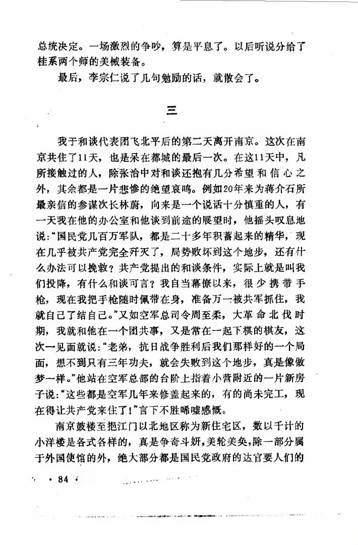 1949年3月31日晚7时,李宗仁在总统府设宴欢送以张治中为首的和谈代表团,我也被邀参加了。宴会后,李宗仁在办公室召开了一个为时仅两小时的重要军事会议。参加者有何应钦、白崇禧、顾祝同、张治中、林蔚、萧毅肃、汤恩伯、王叔铭、刘士毅、关麟徽、宋希濂等共12人。会议讨论了下列3个重要问题: