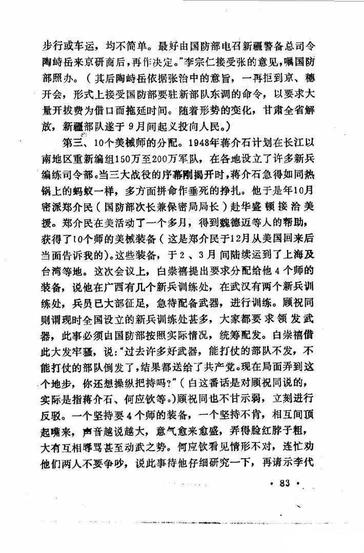 第三、10个美械师的分配。1948年蒋介石计划在长江以南地区重新编组150万至200万军队,在各地设立了许多新兵编练司令部。当三大战役的序幕刚揭开时,蒋介石急得如同热锅上的蚂蚁一样,多方面拼命作垂死的挣扎。他于是年10月密派郑介民赴华盛顿接洽美援。郑介民在美活动了一个多月,得到魏德迈等人的帮助,获得了10个师的美械装备。这些装备,于2、3月间陆续运到了上海及台湾等地。这次会议上,白崇禧提出要求分配给他4个师的装备,说他在广西有几个新兵训练处,在武汉有两个新兵训练处,兵员已大部征足,急待配备武器,进行训练。顾祝同则谓现时全国设立的新兵训练处甚多,大家都要求领发武器,此事必须由国防部按照实际情况,统筹配发。白崇禧借此大发牢骚,说:“过去许多好武器,能打仗的部队不发,不能打仗的部队倒发了,结果都送给了共产党。现在局面弄到这个地步,你还想操纵把持吗?”(白这番话是对顾祝同说的,实际是指蒋介石、何应钦等。)顾祝同也不甘示弱,立刻进行反驳。一个坚持要4个师的装备,一个坚持不肯,相互间顶起嘴来,声音越说越大,意气愈来愈盛,弄得脸红脖子粗,大有互相辱骂甚至动武之势。何应钦看见情形不对,连忙劝他们两人不要争吵,说此事待他仔细研究一下,再请示李代总统决定。一场激烈的争吵,算是平息了。以后听说分给了桂系两个师的美械装备。