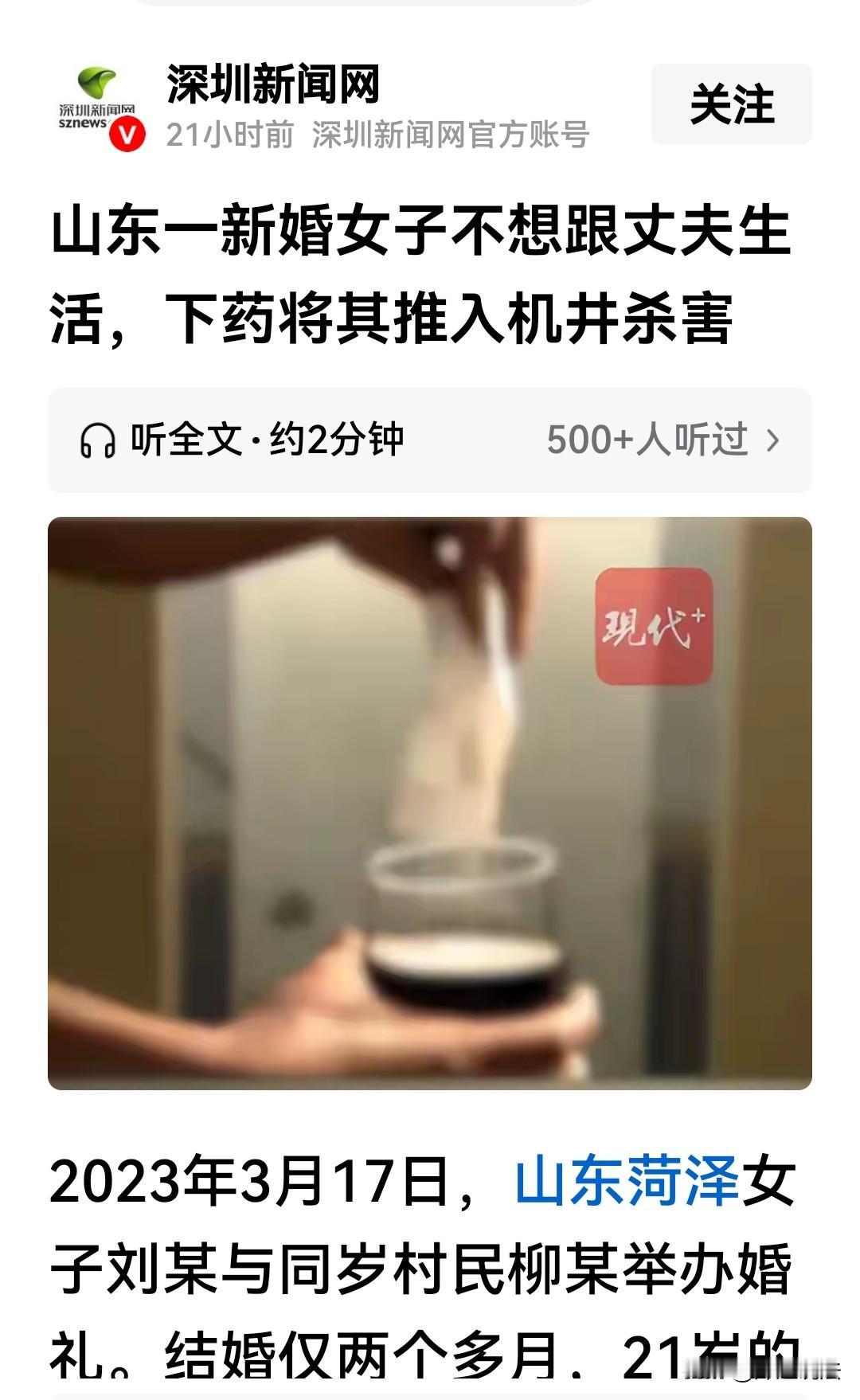 山东菏泽,女子和丈夫才结婚两个月,就不想和对方过了。丈夫喝醉酒后,她哄骗丈夫服下六片复方西泮片,又引诱丈夫到街井下去抓鱼。丈夫不小心掉入水中,让她找人施救,女子前后往返四次都没有进行施救,并且在凌晨二时,居然还将井盖盖好逃离。丈夫也因为井内缺氧导致身亡,最后女子也被判处死 刑,即使不服提起上诉,依然维持原判。 素材:现代快报2025-10-20 2023年3月17日,那是一个好日子,当天有很多新人结婚。21岁的刘女士,也在那一天和同岁的村民柳某结婚了。 她对这段婚姻并不充满期盼,只是顺从了父母的意愿,完成了他们的心愿而已。因此,在婚后的两个月,她就对柳某厌倦不已,总想以种种方法逃离现在的生活。 她想过离婚,但是生怕村里说闲话,刚刚结婚两个月就闹出这样的事,到时候会让自己的父母难堪,让他们老人家不好受。 她想直接外出打工,又觉得丈夫对自己百依百顺,到时候肯定不放心自己出去,一定会跟随其后,这样也摆脱不了对方。 她思前想后,干脆一不做二不休,既然摆脱不了对方,那就让他意外离世,这样村民们也无话可说,自己也能摆脱噩梦。 有了这种想法后,刘女士就开始实施自己的计谋。 5月28日,丈夫告诉刘女士,第二天一起去岳父家吃饭。刘女士发现机会来了,当天就去药店买了一盒复方西泮片,还对丈夫说,自己做了一个梦,有人说去机器里抛硬币可以解梦,让他到时候陪同自己去。 丈夫一边安慰她,一边答应到岳父家吃完饭后就和她一起去。 夫妻俩高高兴兴地到了岳父家吃饭,吃完饭返回家中时,是刘女士开车,因为丈夫喝了很多酒。 当时回家的时候是21点20分,刘女士表现得非常关心丈夫,说为了给丈夫解酒,让他服解酒药。 其实她早已把六片复方西泮片融入水中,让丈夫一并喝下。 到了22时,刘女士就哄着丈夫出门,说想让他陪同自己去找人解梦。 丈夫的身体有点吃不消,但无奈新婚妻子的要求,自己也不能拒绝,于是颤颤巍巍地跟着去了。 其实刘女士早就选好了地址,因此他们绕过几道弯就到了一处枯井,这里常年没有人来,早已是被人遗忘的地方。 丈夫眼睛看东西都发花,头也发晕,听刘女士说水中有鱼,还让他去抓的时候,他一下就清醒了,说不能下去,自己喝了酒,到时候站不稳会滑落下去。 可是刘女士又强迫丈夫下去,说自己就是想吃鱼,现在就想让丈夫去抓。 丈夫没有办法,也只能依着刘女士,刚下到井内深处,就不小心滑到了水中。 谁知道井中的水并不多,丈夫并没有溺水,刘女士有点着急,不知道该怎么办。 丈夫告诉她,赶紧去找人来施救,因为他以为刘女士的着急是不知道如何把自己救上来。 刘女士开车离开,其实她是想出去平复心情,想办法怎么置丈夫于死 地。 回来后看到丈夫还活着,她又离开了,就这样往返四次,每次看丈夫在下面都没事,还在等着自己找人来施救。 于是,刘女士直接搬来井盖,将枯井盖严实后就逃离了现场。 此时的丈夫才如梦初醒,知道新婚妻子是要置自己于死 地,因此在绝望中因井内缺氧,没过一会儿就离开了人世。 这一切虽然她自认为做得天衣无缝,但在民警眼里只是掩耳盗铃,很快就查清了是刘女士的计谋。最后一审判决,刘女士被判死 刑,她觉得不服,却没有给出任何理由,只觉得自己冤枉。 二审判决依然维持原判,最后刘女士也受到了应有的惩罚。 至于她为什么不愿意和丈夫一起生活,最后又起了杀 心,她并没有过多的赘述。 她只说结婚两个月来,这段婚姻让她很不舒服、很不满意,因此才对丈夫起了这样的害人之心。 1、《刑法》第十四条,明知自己的行为会发生危害社会的结果,并且希望或者放任这种结果发生,因而构成犯罪的,是故意犯罪。故意犯罪,应当负刑事责任。 刘女士明知道给丈夫下药、骗他下井、最后盖井盖这些行为,会导致丈夫死亡,她不仅不阻止,反而就是想让这个结果发生。这种“明知故犯”的心态,在法律上就叫故意,只要是故意犯罪,就必须承担刑事责任。 2、《刑法》第二百三十二条,故意杀人的,处死刑、无期徒刑或者十年以上有期徒刑;情节较轻的,处三年以上十年以下有期徒刑。 刘女士的所作所为,从计划买药到最终盖井盖致丈夫缺氧死亡,本质就是故意夺走丈夫的生命,完全符合“故意杀人”的定义。 法院之所以判她死 刑,是因为她的行为属于“情节恶劣”,比如精心策划、见死不救、手段残忍,所以会适用最重的刑罚档位。 对于此事,大家如何看?