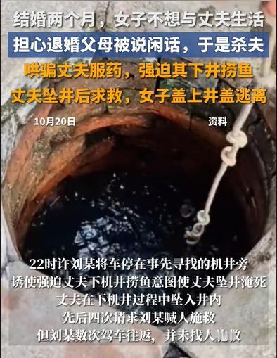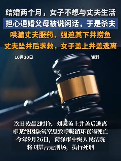 山东菏泽,一男子刚结婚两个月就坠井而亡,但警方介入调查后,从男子身体中检查出了安眠药的成分,认为此事并非意外。然而随着调查结果的浮现,这结果却让人觉得荒唐,同时又心惊不已。(来源:荆楚网,菏泽市中级人民法院) 据悉,男子柳某和妻子刘某都是21岁,在2023年3月17日办了婚礼仪式。可二人结婚才2个月,刘某就发现和柳某过不下去了,正好二人没领证,所以刘某就想要退婚。 然而刘某如果主动提出退婚,那到时候可能被村里人说是来坑彩礼的或者外面有人了,她担心自己的父母会没脸见人,于是又隐忍了下来。 可是刘某还是没能忍住,在同年5月29日晚上,刘某带着柳某回了趟娘家,期间去药店买了一盒安眠药。在吃晚饭的时候,刘某又让柳某多喝了点酒。 当晚21时20分左右,刘某开车带着柳某回家。路上她以解酒为由,将6片安眠药放在水中哄着丈夫喝了下去。 半个多小时后,刘某见柳某开始有些迷迷糊糊了,于是将车停在一处机井旁,随后刘某将柳某诱骗下车,让其下井去捞鱼。 柳某稀里糊涂地下了机井,结果在下到一半时,可能因安眠药药效发作,柳某一下子就摔了下去,随后他大喊让刘某去帮忙叫人救援。刘某立即答应了下来,随后便开车走远了。 次日凌晨2时许,刘某再次回到机井旁,她仔细听了一会,发现机井内已经没了动静,于是给机井盖上了盖子,随后再次离开了现场,而柳某最终因缺氧窒息而死亡。 对于刘某的行为,不少网友纷纷对其进行指责,称其太恶毒了。还有网友不理解,就算是怕退婚被说闲话,那也不能杀人啊,夫妻之间有这么大的仇吗? 本案中,刘某为什么和柳某过不下去了,这个原因尚未搞明白,但这并不妨碍对于刘某行为的定性。 从刘某有计划的去买安眠药,以及十分熟练的将柳某带到机井处来看,说明刘某早就有了杀害柳某的预谋,并且为此采取了一些行动。 因此,刘某将柳某带到机井处的行为,属于故意杀人的预备阶段,同样会构成故意杀人罪。 在柳某被刘某哄骗下井后,刘某法定义务救助柳某的,但她并未选择救助,而是等安眠药的药效发作后,将井盖给盖上了,导致柳某在昏睡中因缺氧死亡。 综上来讲,刘某既有杀人的主观目的,又实施了杀人的行为,且最终导致柳某死亡。 根据主客观相统一原则,刘某的行为构成故意杀人罪,且情节是十分恶劣的。 根据《刑法》第232条规定,故意杀人的,处死刑、无期徒刑或者10年以上有期徒刑;情节较轻的,处3~10年有期徒刑。 注意:上述规定中的“情节较轻”,一般是指出于义愤致人死亡、防卫过当致人死亡、帮助他人自杀等情况。 但本案中,刘某的犯罪动机极其卑劣,而且为了杀害柳某还精心策划了一番,这种有预谋的杀人,情节是十分恶劣的,所以刘某的行为无法认定为情节较轻的情形。 最终,法院判处刘某死刑,剥夺政治权利终身。 可万万没想到,刘某还不服,提起了上诉要求法院轻判。 但二审法院经过审理后,认为刘某的主观恶性太大,且造成的影响十分恶劣,于是判决驳回了刘某的上诉请求。 那二审法院的判决生效后,是不是立即可以对刘某执行死刑了呢? 其实按照程序来说并不是,死刑作为刑法中最重的刑罚,所以在适用时必须格外的谨慎。 《刑法》第48条规定,死刑只适用于罪行极其严重的犯罪分子。对于应当判处死刑的犯罪分子,如果不是必须立即执行的,可以判处死刑同时宣告缓期2年执行。死刑除依法由最高人民法院判决的以外,都应当报请最高人民法院核准。 也就是说,如果终审法院不是最高人民法院,那在二审法院作出终审死刑判决后,需要报请最高人民法院进行核准,而核准的期限大概在2个月以上。对于一些重大刑事案件,核准的期限将会更长。 最后,在今年的9月26日,刘某已被法院执行死刑。 对于本案,您怎么看?欢迎留言交流。