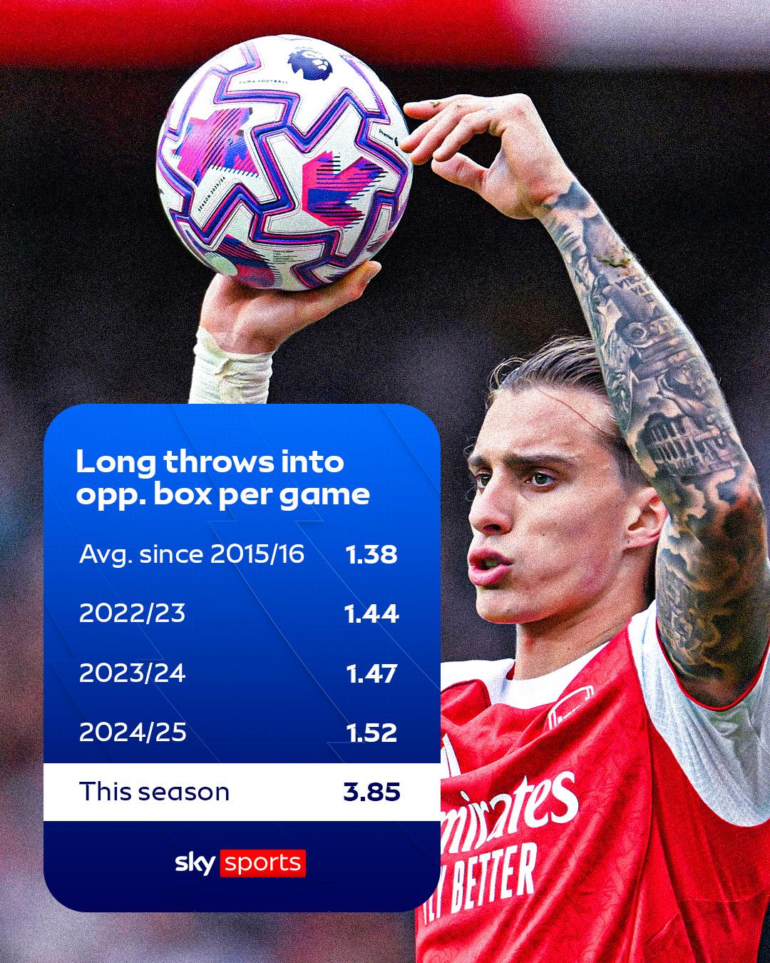 而在天空体育列出的另一项数据中,五大联赛中,英超以场均3.85次大力手抛球至对手禁区领跑,德甲以3.60次紧随其后,排名之后的是意甲2.42次,西甲的1.65次及法甲的1.08次。