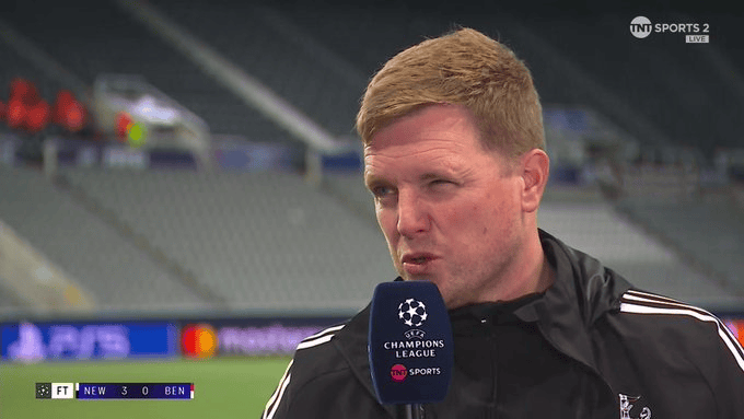虎扑10月22日讯纽卡斯尔主教练埃迪豪在3-0击败本菲卡的赛后,接受TNTSport采访。