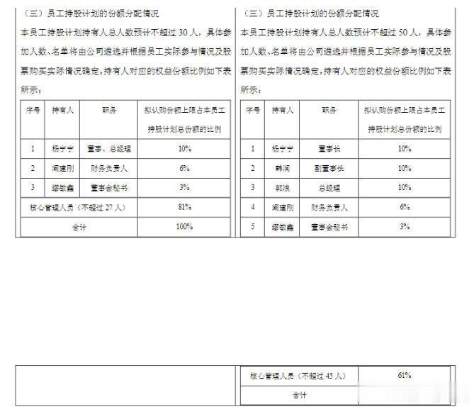 九阳股份第一期员工持股计划的参与者只有公司高管和核心管理人员,包括董事长、副董事长、总经理、财务负责人、董事会秘书等,并且中途进行过变更,参与人数由最多不超过27人调整为最多不超过45人。