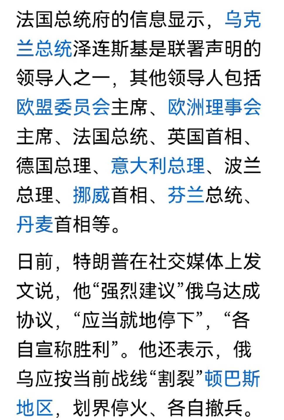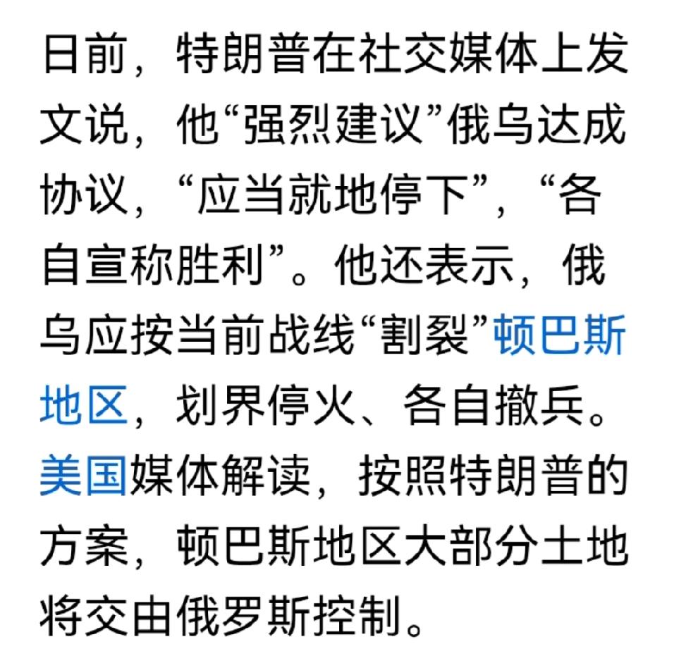 欧美想从乌克兰抽身?能由着性子来吗?试看西方玩外交风云! 泽连斯基不听特朗普的话,被赶出白宫,想开记者发布会,白宫不让开,连个会议室都不提供,只给了一个把掌大的圆椅子,在马路边上摆了个地滩,这应该是开创了元首记者会的先河!不想当孙子,羞耻感和下马威让你屈服! 这不,特朗普发文下令,就地停战,各自宣布胜利,这就是乌克兰用土地换胜利,俄罗斯得土地换胜利,至于能不能实现是后话,先给嘴过个瘾,展现一下威力。 泽连斯基果然和欧洲10位领导人发了联合声明,强裂支持特朗普的俄乌战争立场,以当前战线做为谈判起点。 美国、英国、法国、德国、意大利、挪威、芬兰、丹麦、波兰、欧盟着什么急?想抽身? 可奇怪的是没有俄罗斯参与,这哪里是外交,完全是自乐,暴露了美欧西方外交的随性和无知,另外重点是俄罗斯会听你的,象这种战略目标的战争,俄罗斯肯定要把损失补回来,要把目标达到,不然不可能停手,欧美虽想抛弃乌克兰换抽身,恐怕是一箱情愿。 乌克兰局势 西方乌克兰联盟 美欧乌克兰会谈 西方外交转向 美国外交局势