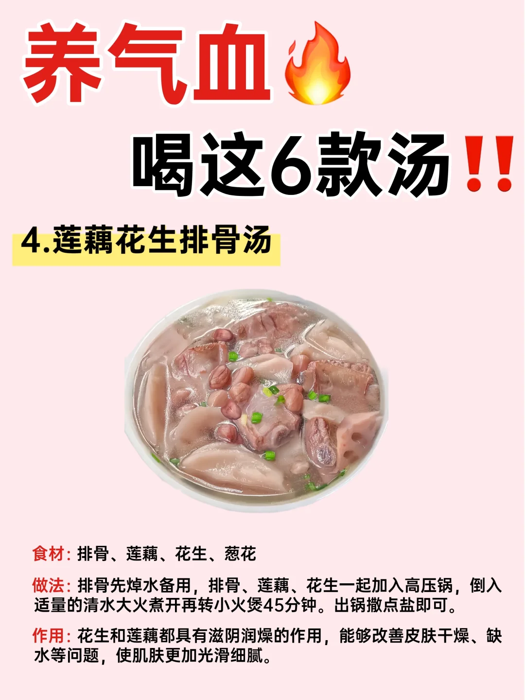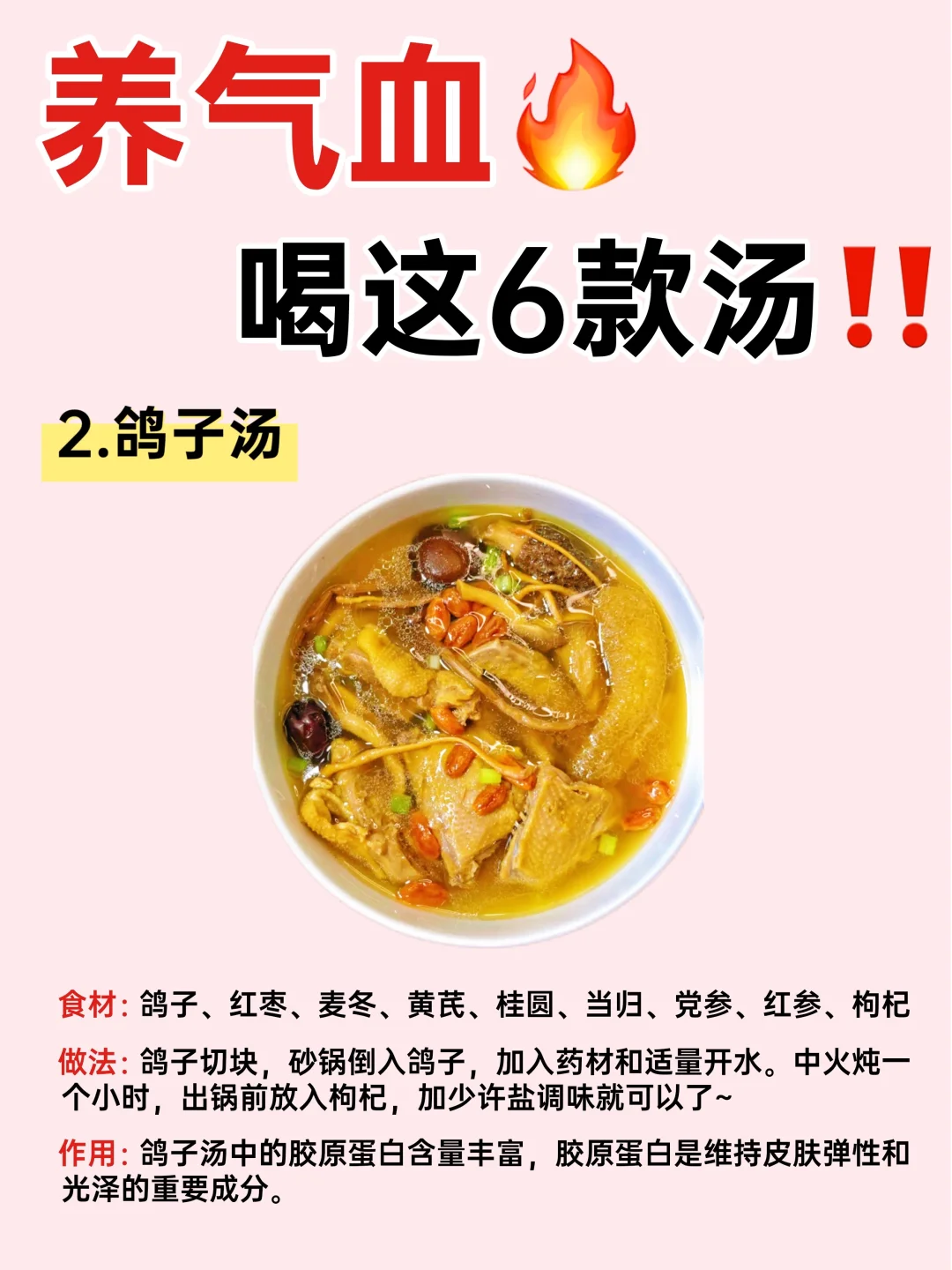 🥰女孩子一定要多喝这些‼️给姐妹们整理了6种养气血汤合集🔥附详细做法㊙️秋季必备✅女生素颜快乐汤✅喝1个月气色越来越好‼️快艾特你的对象给你做~ 💫详细的养气血汤教程都在图上👆!! 附养气血汤🧾: 🥣乌鸡汤 🥣鸽子汤 🥣鲤鱼汤 🥣红枣银耳汤 🥣五红汤 🥣莲藕花生排骨汤 喜欢💕请多多点赞,谢谢支持~