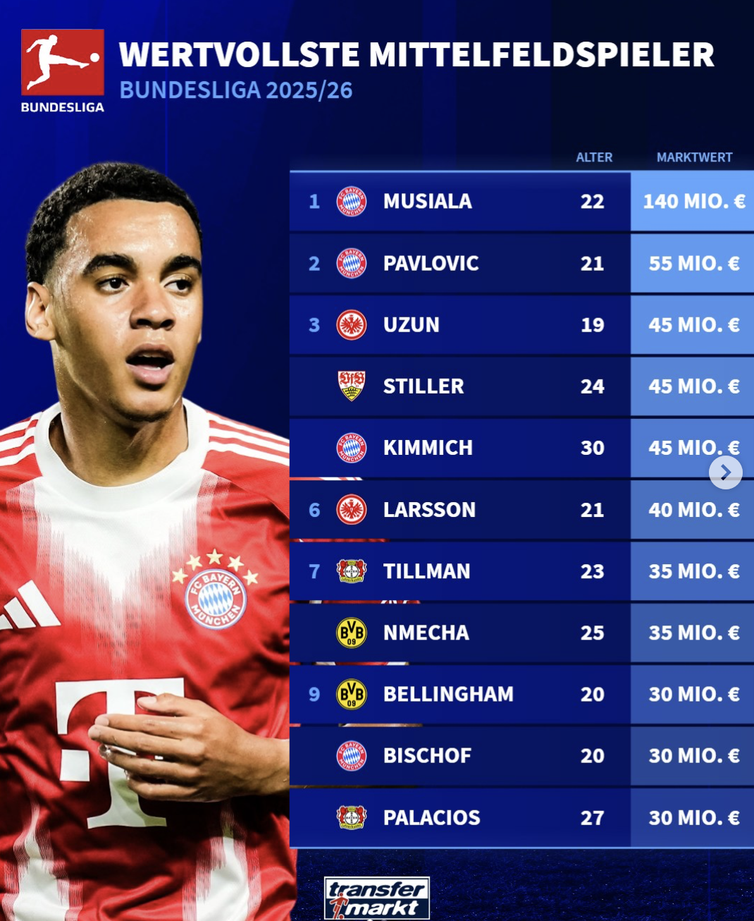 拜仁的穆夏拉以1.4亿欧元断层领先,帕夫洛维奇以5500万排名第二。