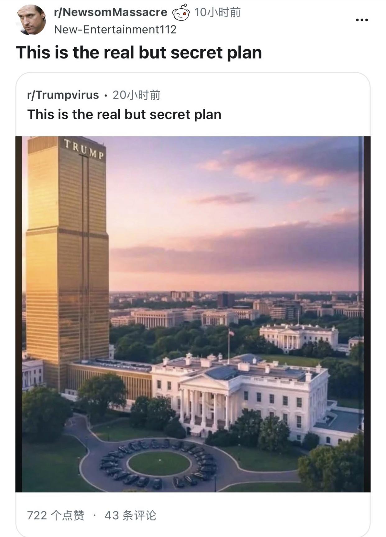 美国网友给特朗普画的白宫东翼拆除后重建宴会厅的房子“金色特朗普大夏”,象征着特朗普永远在白宫。