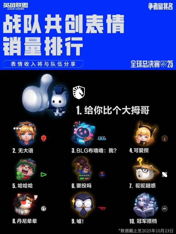 直播吧10月24日讯英雄联盟赛事官博分享目前战队表情销量前十名。其中TL的吉祥物点赞排在第一,TES、BLG分列二三位。