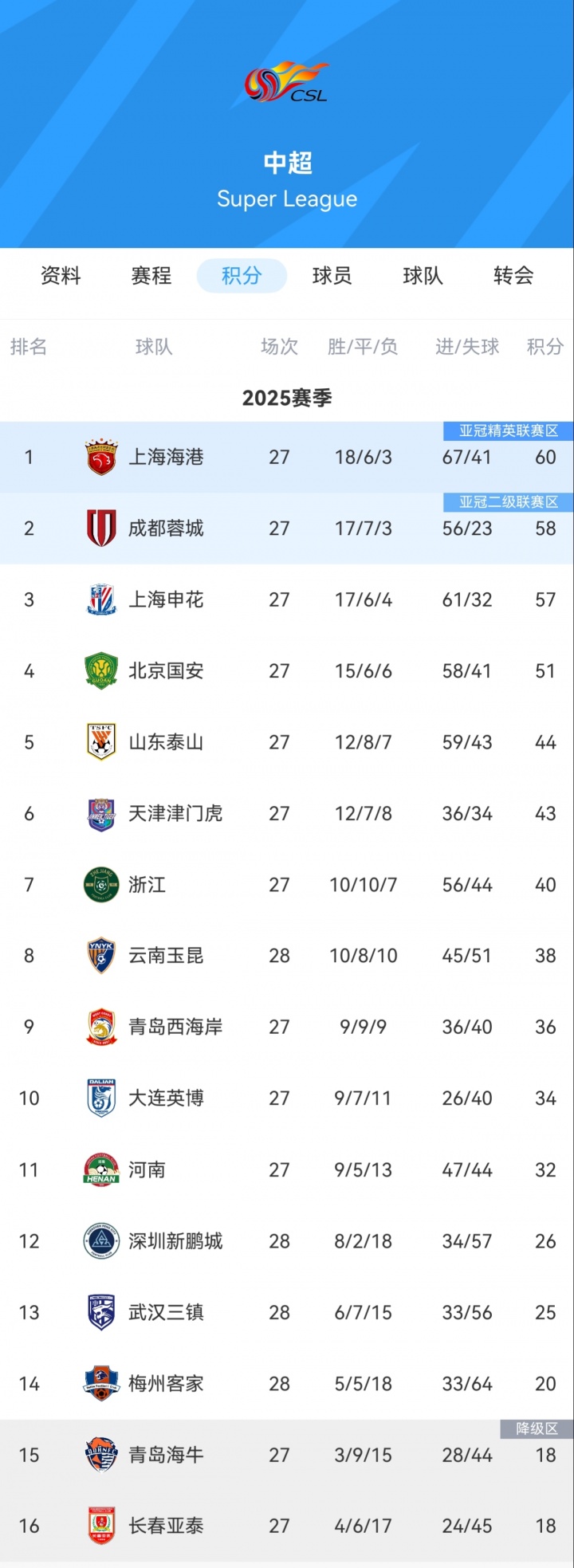 保级形势方面,深圳领先降级区8分、三镇领先7分,已经基本完成保级任务,梅州、海牛、亚泰争最后1个保级名额。