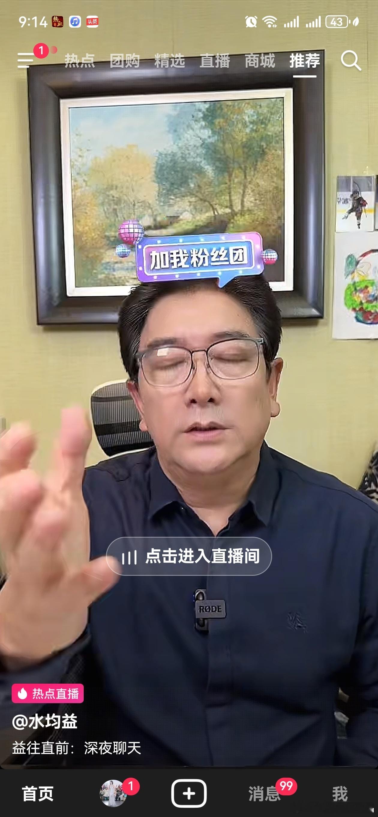 水均益老师也在抖开直播了,直播间人数好多,6万+了