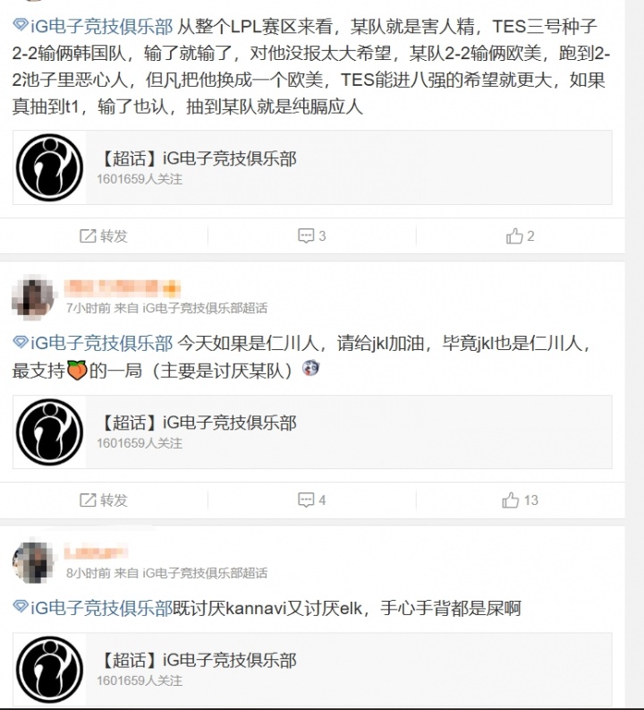 iG超话热议TESvsBLG:既讨厌kannavi又讨厌elk,手心手背都是屎啊