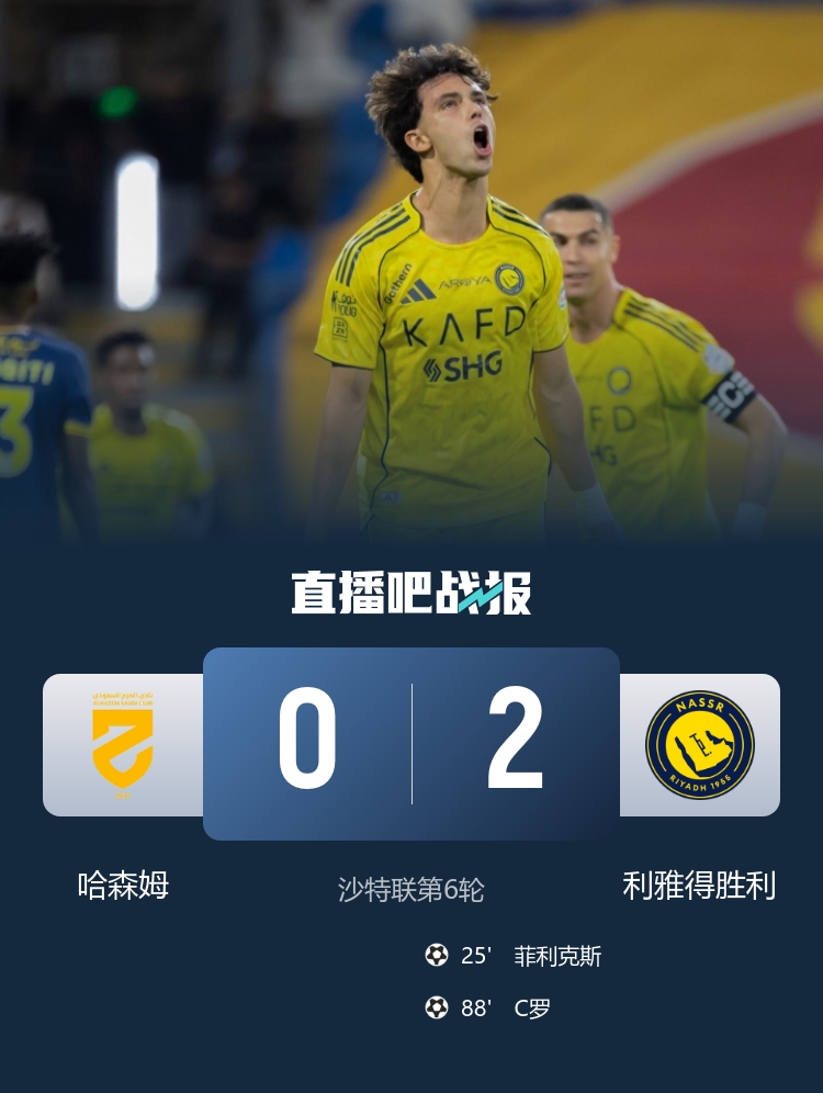 直播吧10月26日讯沙特联第6轮,哈森姆对阵利雅得胜利。上半场,菲利克斯破门。易边再战,C罗破门收获生涯950球。最终利雅得胜利2-0哈森姆。