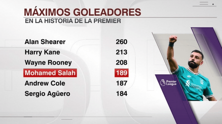 根据ESPN的统计,萨拉赫目前以189个进球,跻身英超联赛历史射手榜第四位,距离身前的鲁尼还差19球。