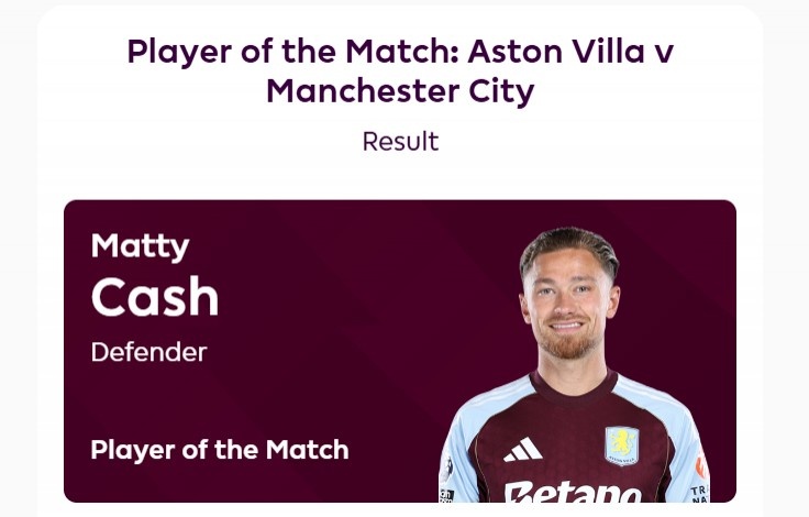 据赛后英超官方的消息,打进制胜进球的卡什当选此役全场最佳球员,在评选中获得58%的投票。