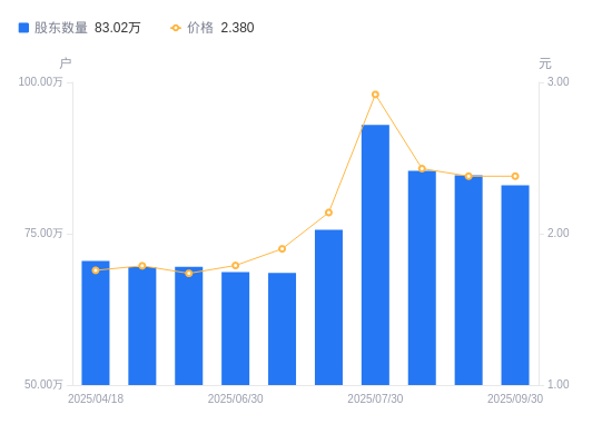 近一年(2024年9月30日至2025年9月30日),包钢股份A股股东户数从72.49万户,增加至83.02万户,增幅14.52%,区间股价上涨51.79%。