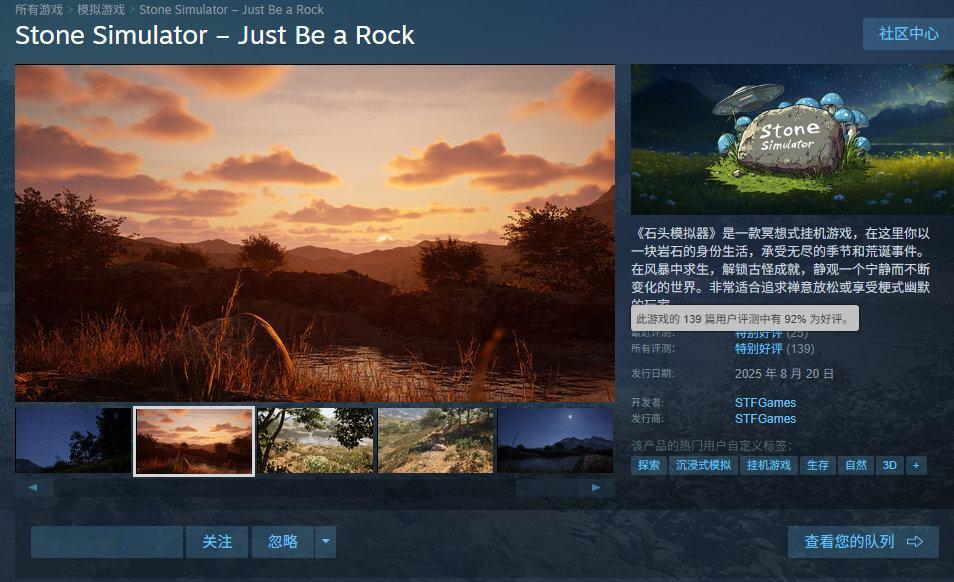 冥想式挂机游戏《石头模拟器》联机模式已上线,最多支持四名玩家联机游玩。本作目前在Steam上享新史低优惠,折后10.5元,11月8日截止,好评率为92%,收录超100篇玩家评测。