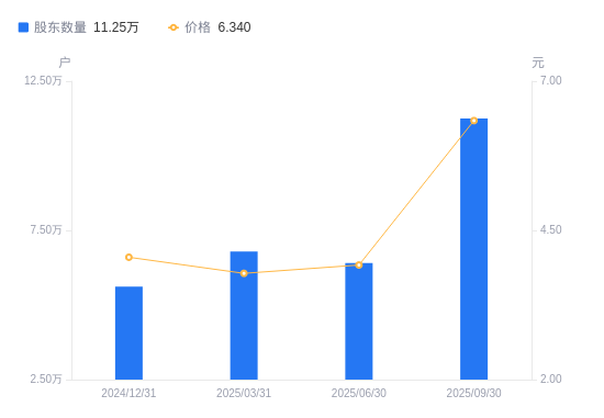 日期A股户数(户)流通A股户均持股数(股)户均持股市值(万元)2025-09-3011248311830.837.502025-06-306406220773.118.142025-03-316794219586.817.402024-12-315613423706.979.602024-09-303563627213.589.312024-06-303709626142.538.372024-03-313961624479.627.912023-12-313966524477.269.522023-09-304147219362.447.242023-06-304517317776.086.82