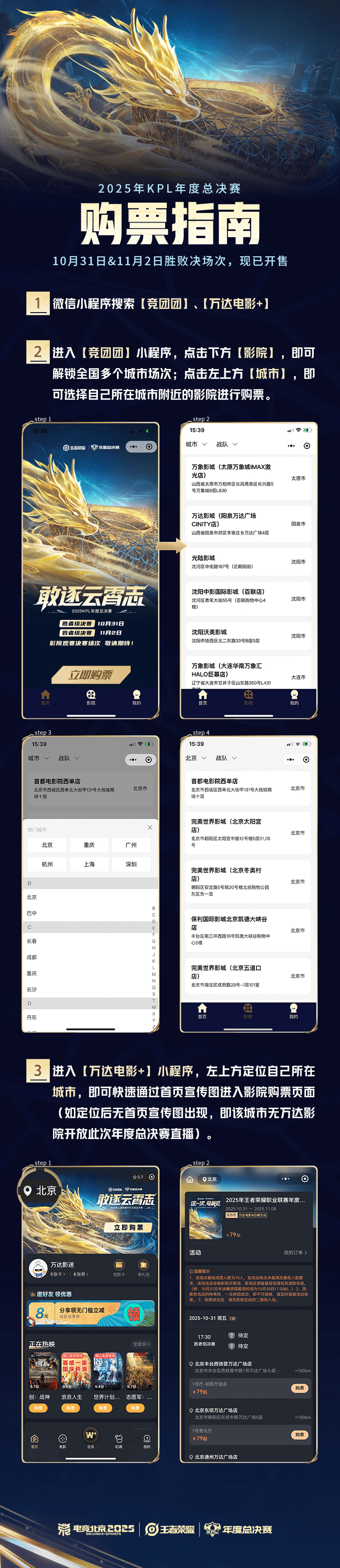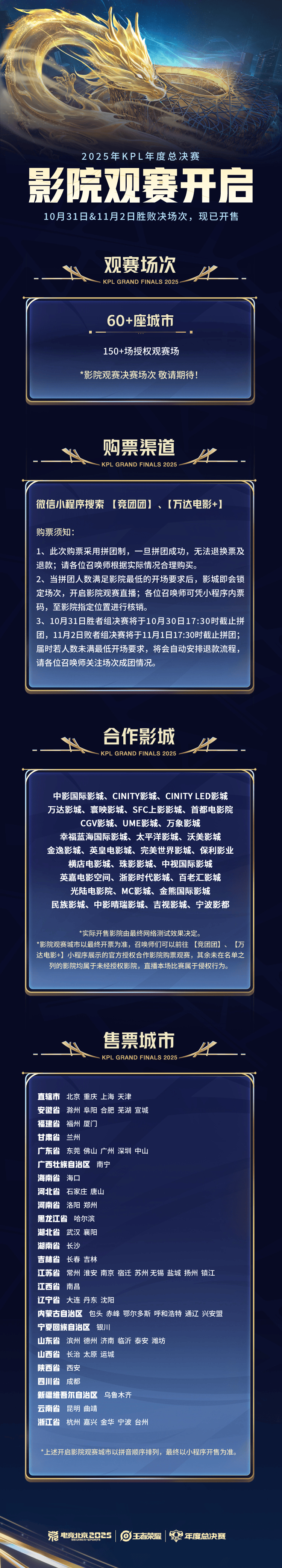 官方影院观赛城市以最终开票为准,观众们可以前往[竞团团]、[万达电影+]小程序展示的官方授权合作影院购票观赛,其余未在名单之列的影院为未经授权影院,直播本场比赛属于侵权行为。