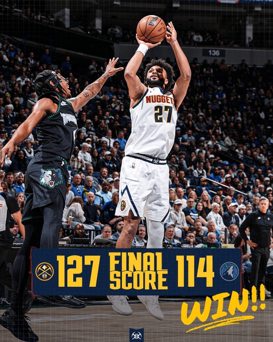 虎扑10月28日讯今天NBA常规赛掘金客场对阵森林狼的比赛已经结束。全场战罢,掘金以127-114战胜森林狼。