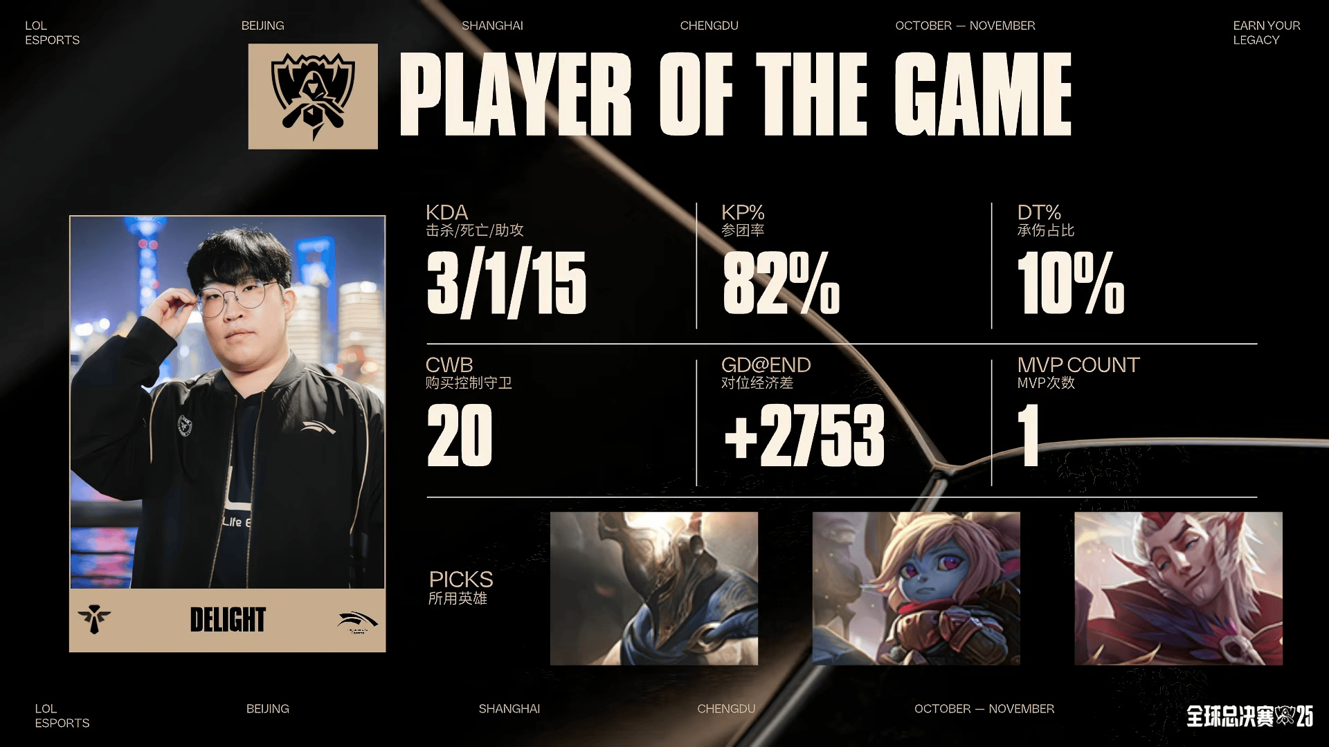 虎扑10月28日讯在刚刚结束的S15淘汰赛的比赛中,Delight洛砍下3/1/15的战绩,拿下HLE对阵GEN第三局MVP