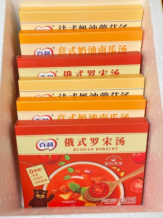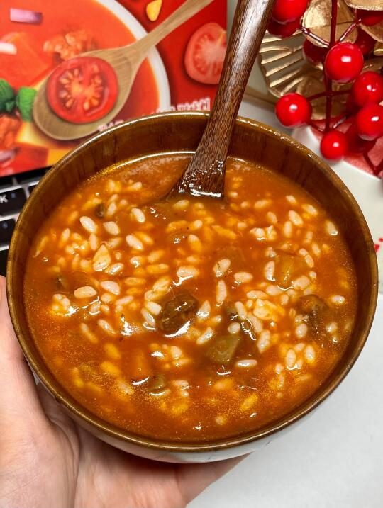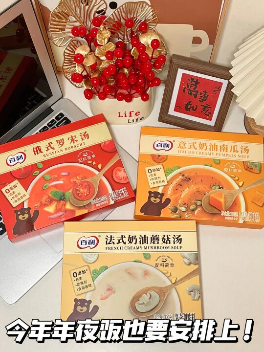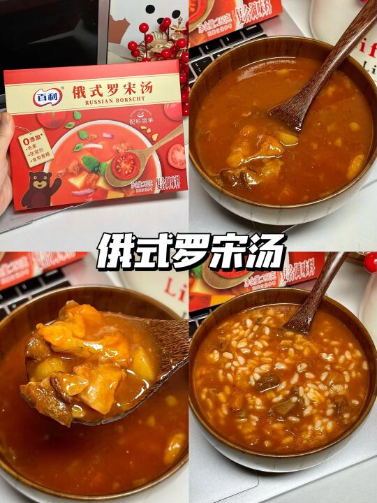 无意中发现了这个罗宋汤的神仙吃法!拌米饭🍚! 番茄脑袋简直爱惨了!! 用的就是这个俄式罗宋汤!里面有番茄颗粒还有牛肉粒!料挺丰富的! 直接盖在米饭上!一口就给我香迷糊了! 酸酸甜甜的还有点奶油香!太上头了! 还入了🎃意式奶油南瓜汤和🍄法式奶油蘑菇汤! 就跟日料店的一模一样!! 而且不需要开火,直接隔水加热即可!超方便! 年夜饭也要安排上!太香了!