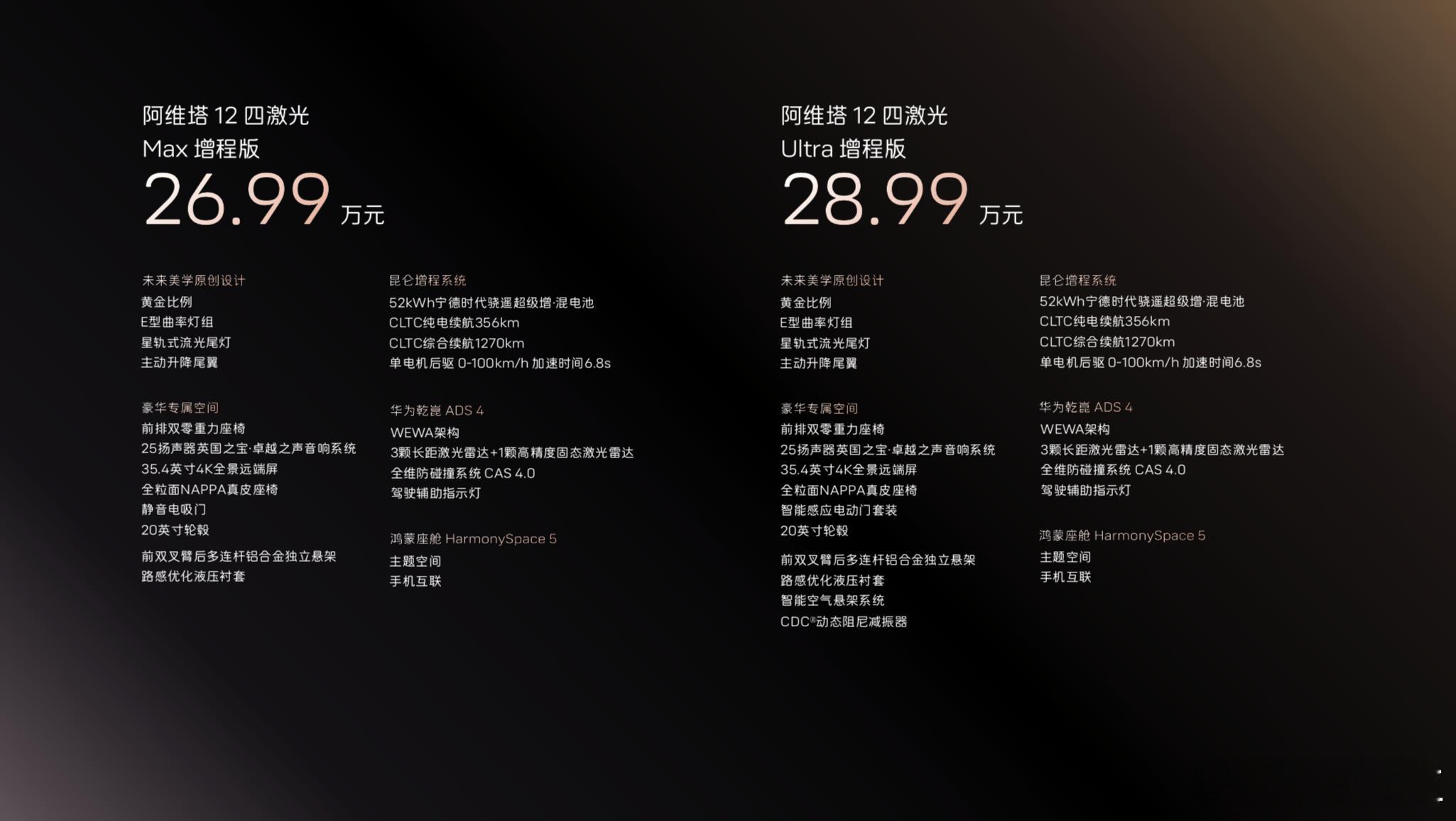 今天阿维塔12四激光版上市 推出纯电、增程双动力共6个版本,官方指导价26.99万-42.99万元,权益后25.99万-41.99万元,至高可享43760元限时权益,含置换现金、ADS功能包抵扣券等礼遇。