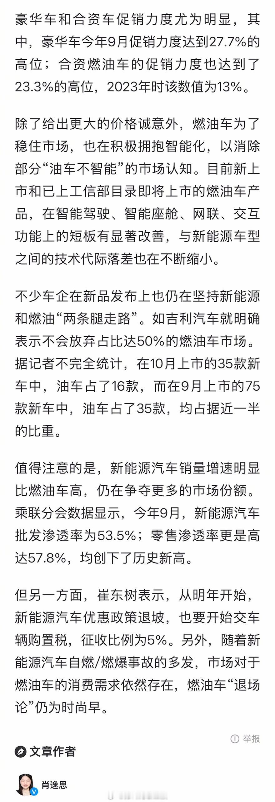 崔东树指出,2026年起新能源汽车优惠政策将逐步退出,车辆购置税也将按5%的比例征收。加之新能源汽车自燃、燃爆事故频发,市场对燃油车的消费需求仍未消退,所谓燃油车“即将退场”的说法还为时尚早。大v聊车专家称燃油车退场论仍为时尚早燃油车销量连续四个月增长