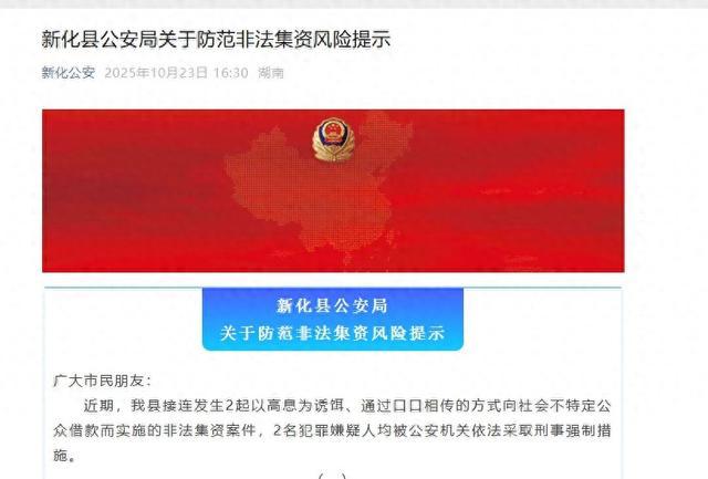 提示中称,新化县近期接连发生2起以高息为诱饵、通过口口相传的方式向社会不特定公众借款而实施的非法集资案件,2名犯罪嫌疑人均被公安机关依法采取刑事强制措施。