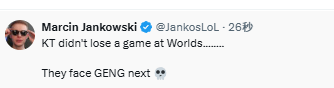 Jankos:KT本次世界赛小局一场未败,他们接下来将面对GEN