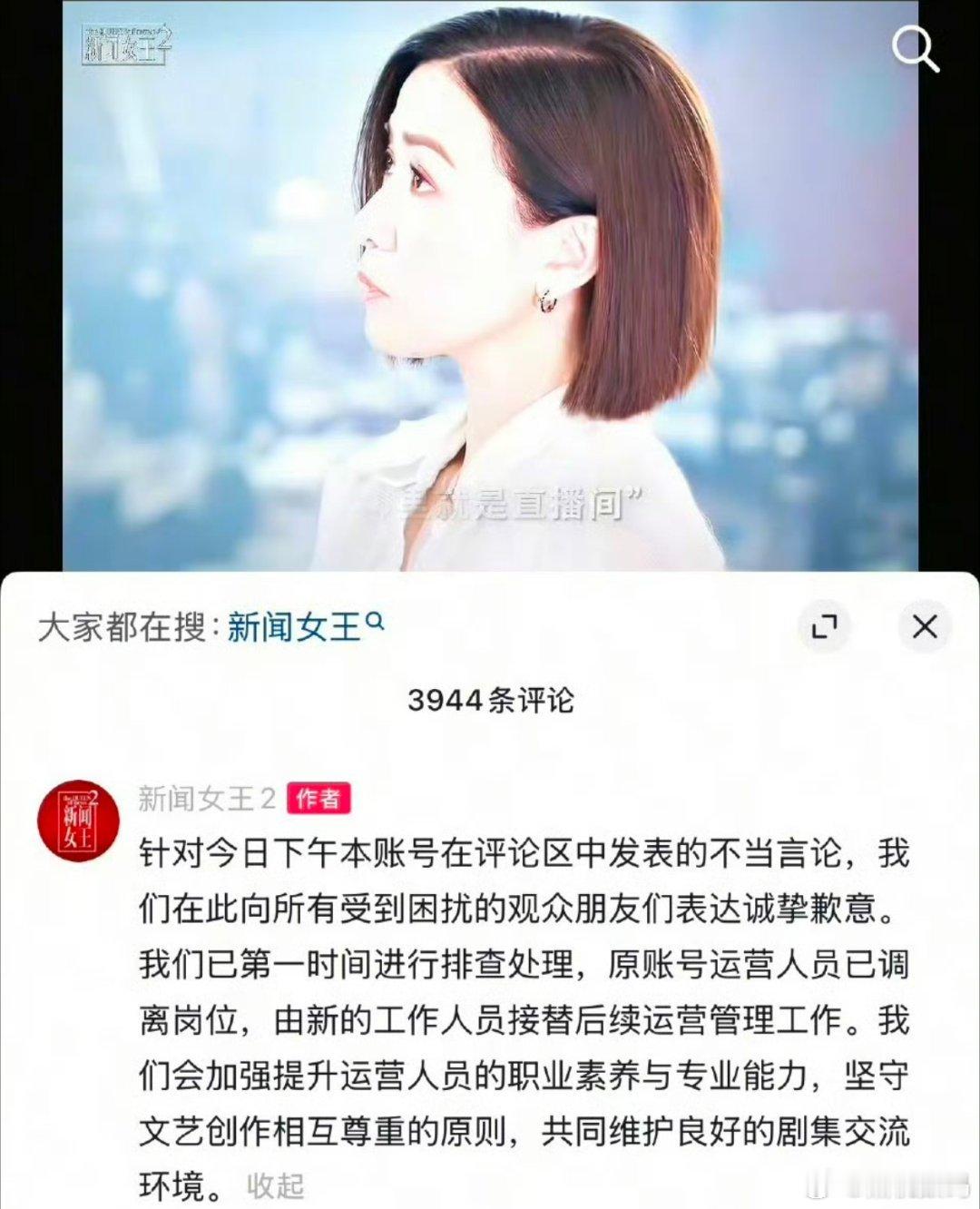 新闻女王道歉 近日,《新闻女王》官方抖音的运营方公开致歉。事件的源头是有观众在评论中提及“《许我耀眼》想要呈现的感觉便是如此”,账号皮下工作人员却直接回复“不是一个赛道”,该回应引发后续争议,最终运营方选择道歉。