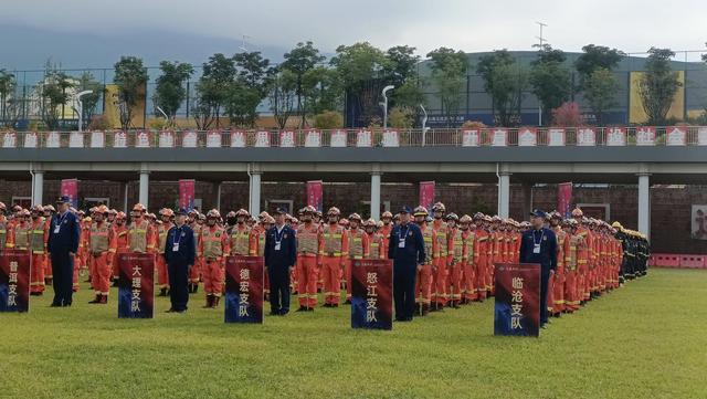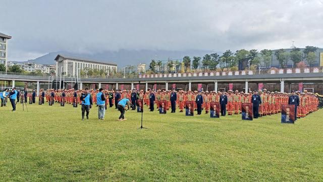 10月27日上午,云南省消防救援队伍第八届“云岭利剑”执勤岗位练兵比武竞赛开幕式在玉溪举行。全省16个州市支队灭火救援指挥部部长、总队机关相关处室负责人、裁判员团队及592名参赛队员齐聚赛场参加开幕式。