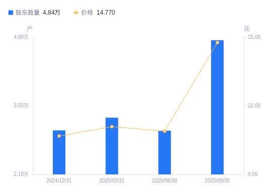 日期A股户数(户)流通A股户均持股数(股)户均持股市值(万元)2025-09-304841911311.2316.712025-06-302993718294.3619.922025-03-313258316808.7218.642024-12-312998018268.1319.512024-09-302994118291.9216.702024-06-303102717651.6713.082024-03-313206617079.7214.572023-12-313448015883.9416.612023-09-303672614912.5517.242023-06-303528915519.8117.06