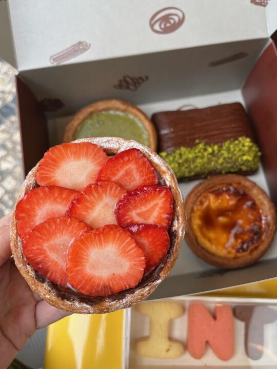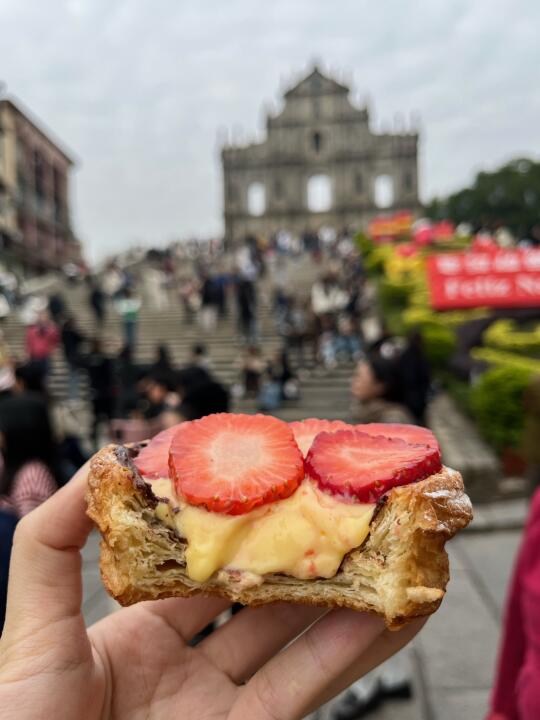 就在大三巴附近的位置!好好找! 走路几分钟 0r领到了韩国同款mbti小曲奇!!!😭😭 满满卡仕达酱的草莓挞一口爆浆!面包的颜值都好高!澳门的uu也太幸福了吧!!