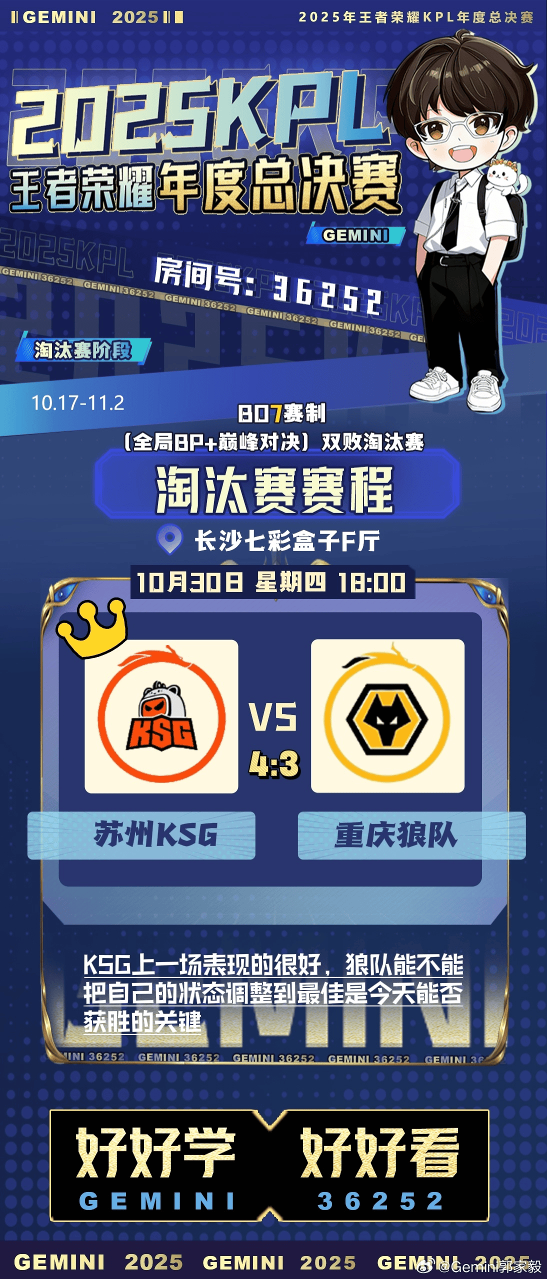 虎扑10月30日讯Gemini预测今日赛事:KSG巅峰对决淘汰狼队,今天不可能零封,原文如下: