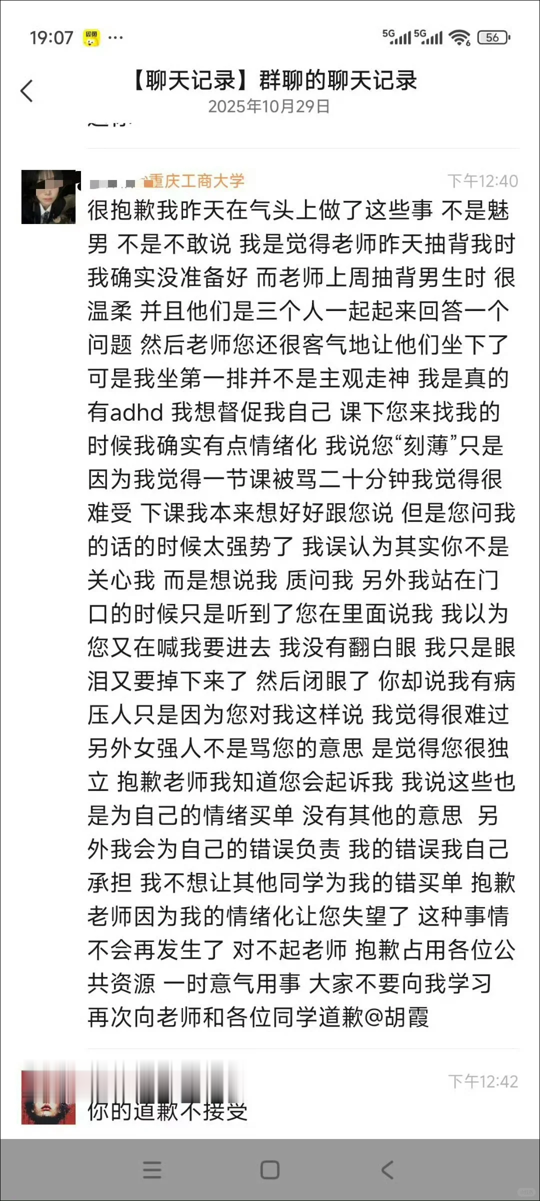 随后该学生发文道歉,称因课堂抽背等情况产生误会,误判老师行为,愿为自己的情绪和行为买单并承担责任。但老师不接受道歉,认为道歉无法化解诋毁造成的伤害,强调会让学生承担法律责任。老师还称,要把这个案例给学生好好讲讲,“昨天还有同学担心学到的知识落不了地,今天不就落地了吗”。