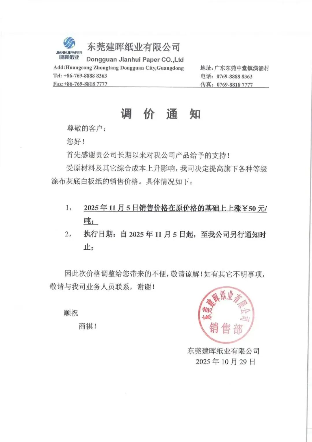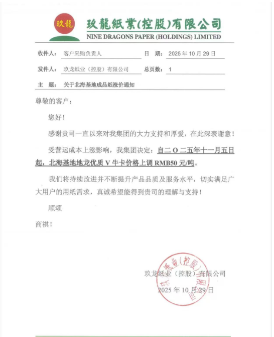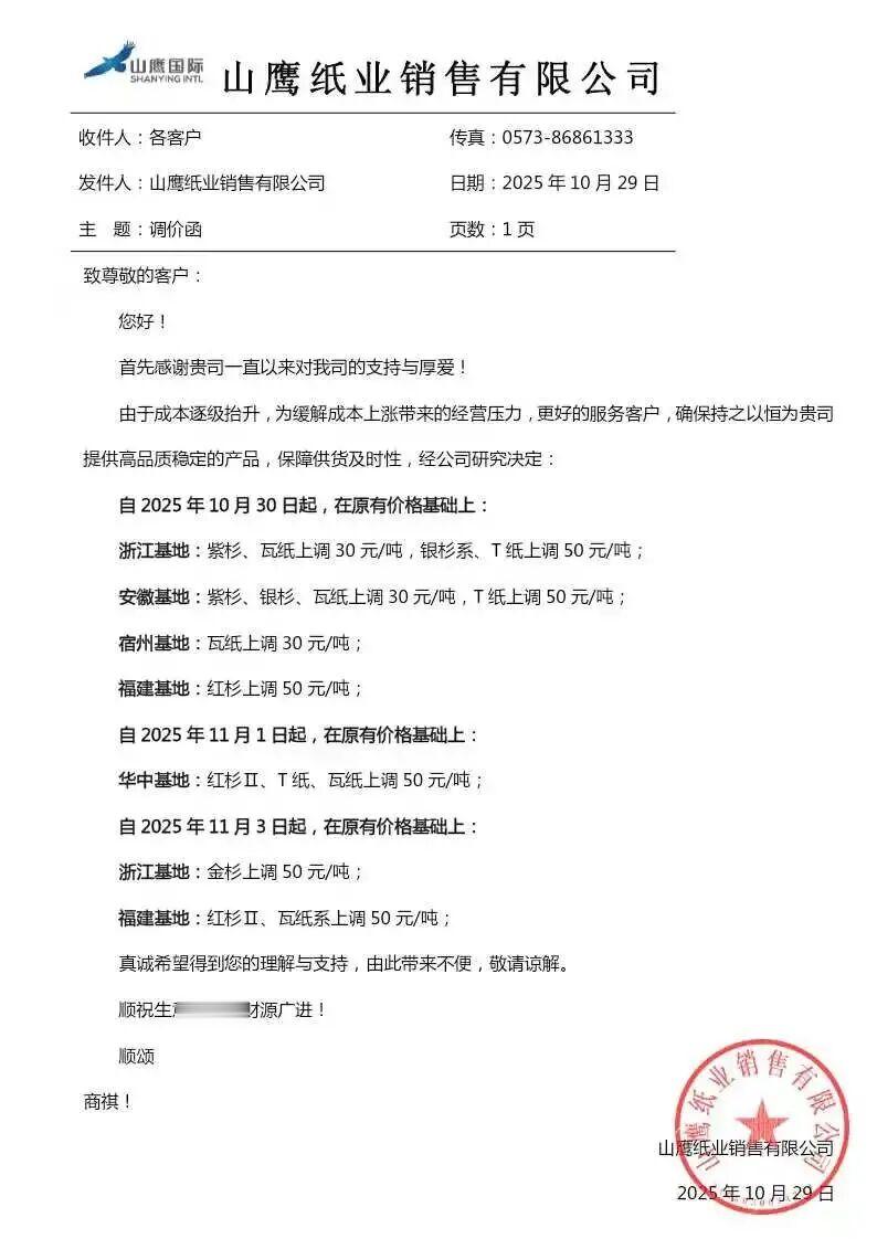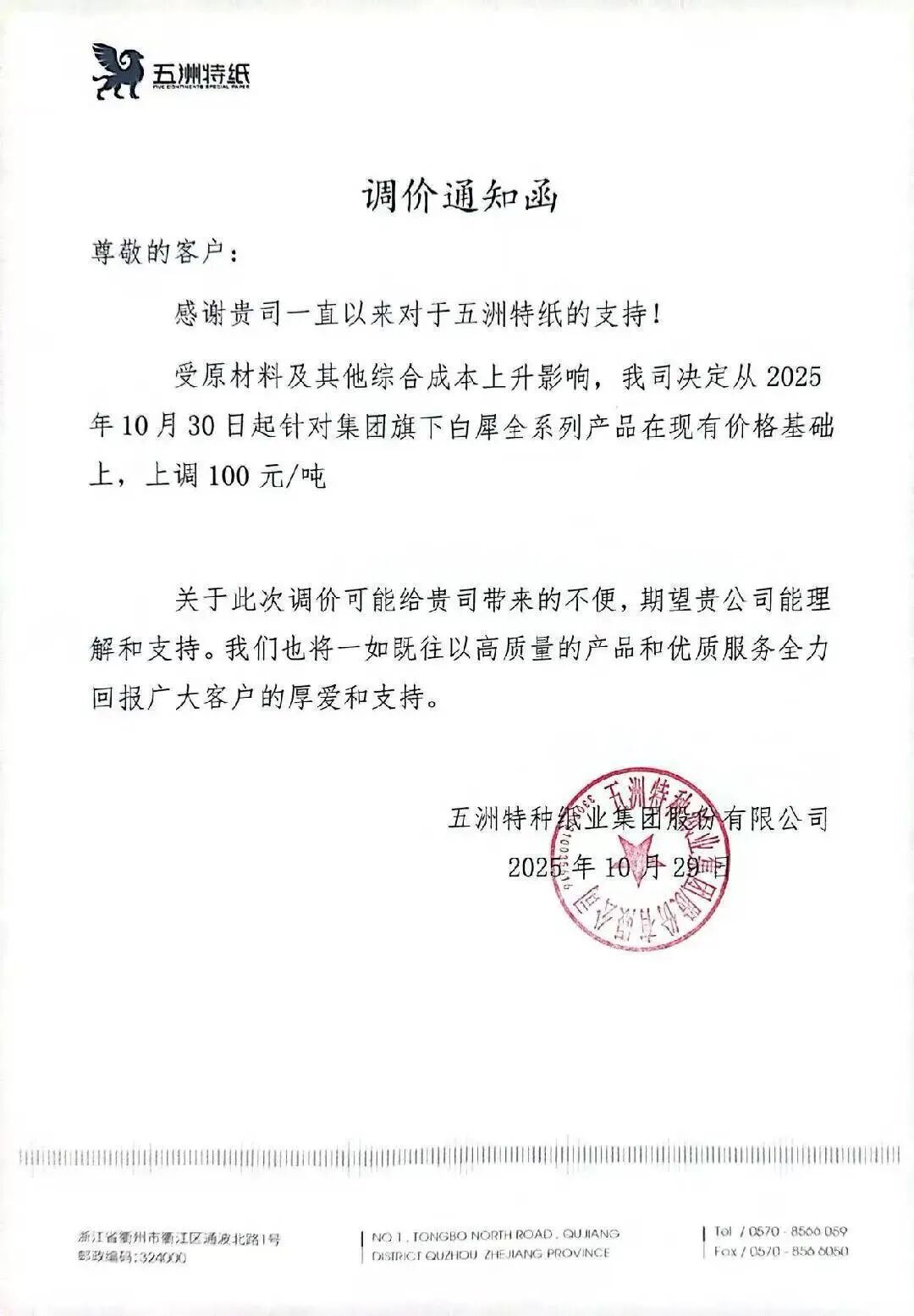 受原材料及其他综合成本上升影响,公司决定从2025年10月30日起针对集团旗下白犀全系列产品在现有价格基础上,上调100元/吨。