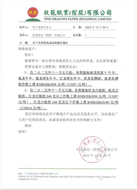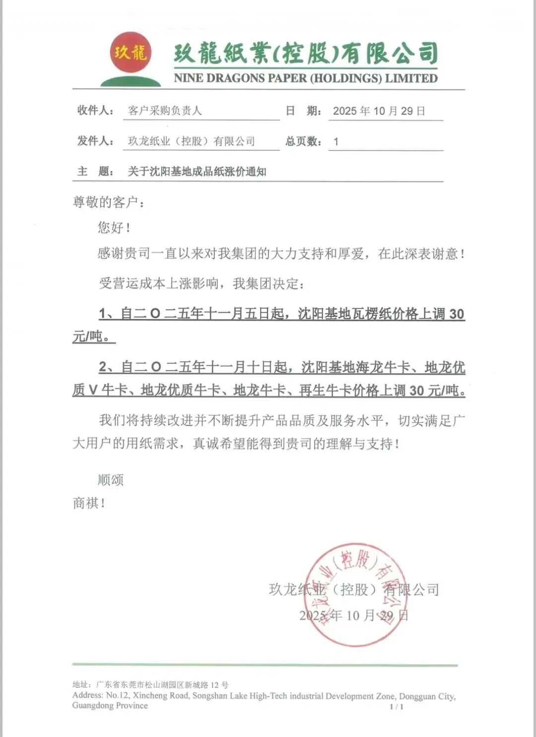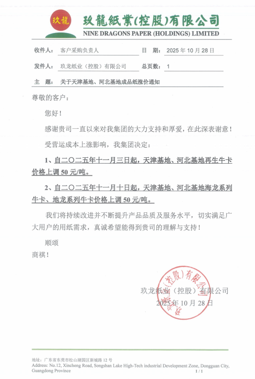 1、自11月5日起,东莞基地地龙优质V牛卡、地龙牛卡、地龙再生牛卡、江龙再生牛卡、玖龙瓦楞纸、地龙瓦楞纸价格上调RMB/HKD50元/吨(USD7元/吨)。