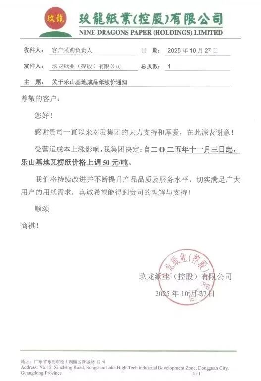 自十一月三日起,乐山基地瓦楞纸价格上调50元/吨。