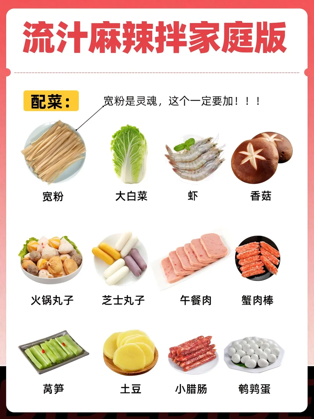 宽粉(灵魂C位‼️)、火锅丸子、虾、午餐肉、蟹棒、鹌鹑蛋、土豆片、藕片、香菇、玉米、油条、泡面…