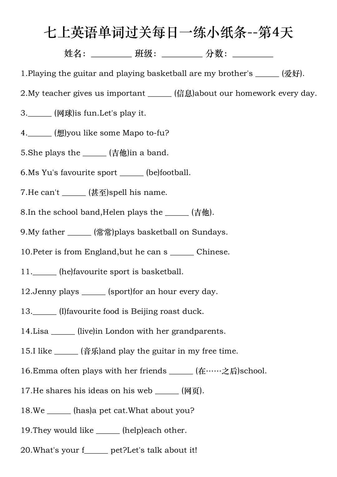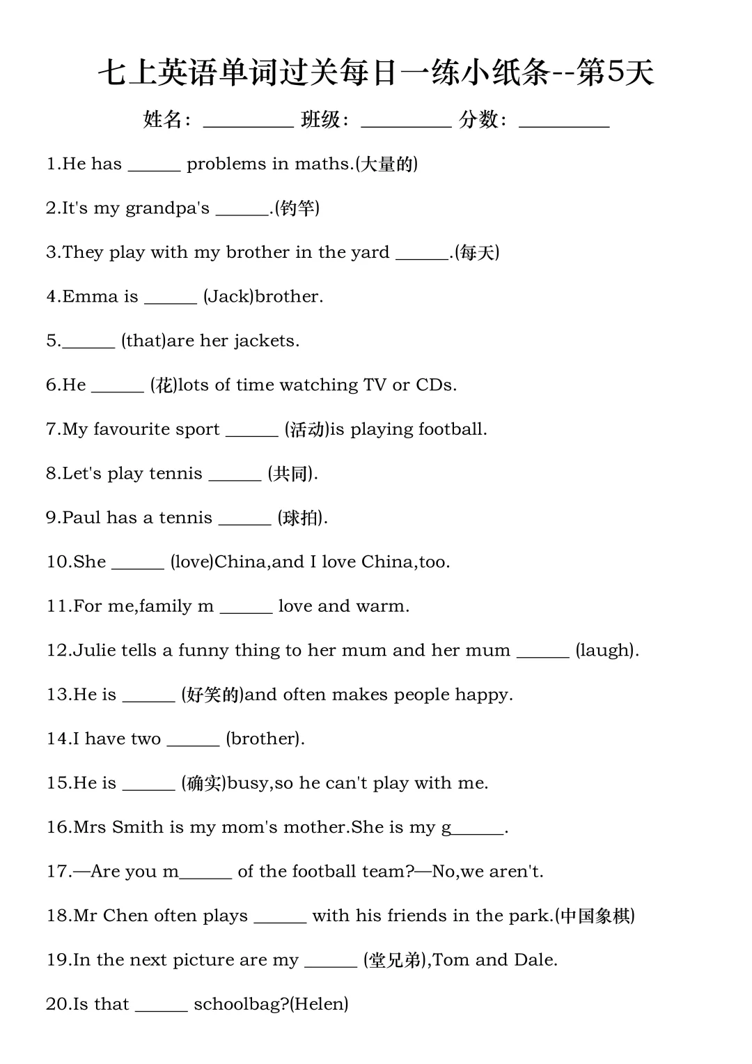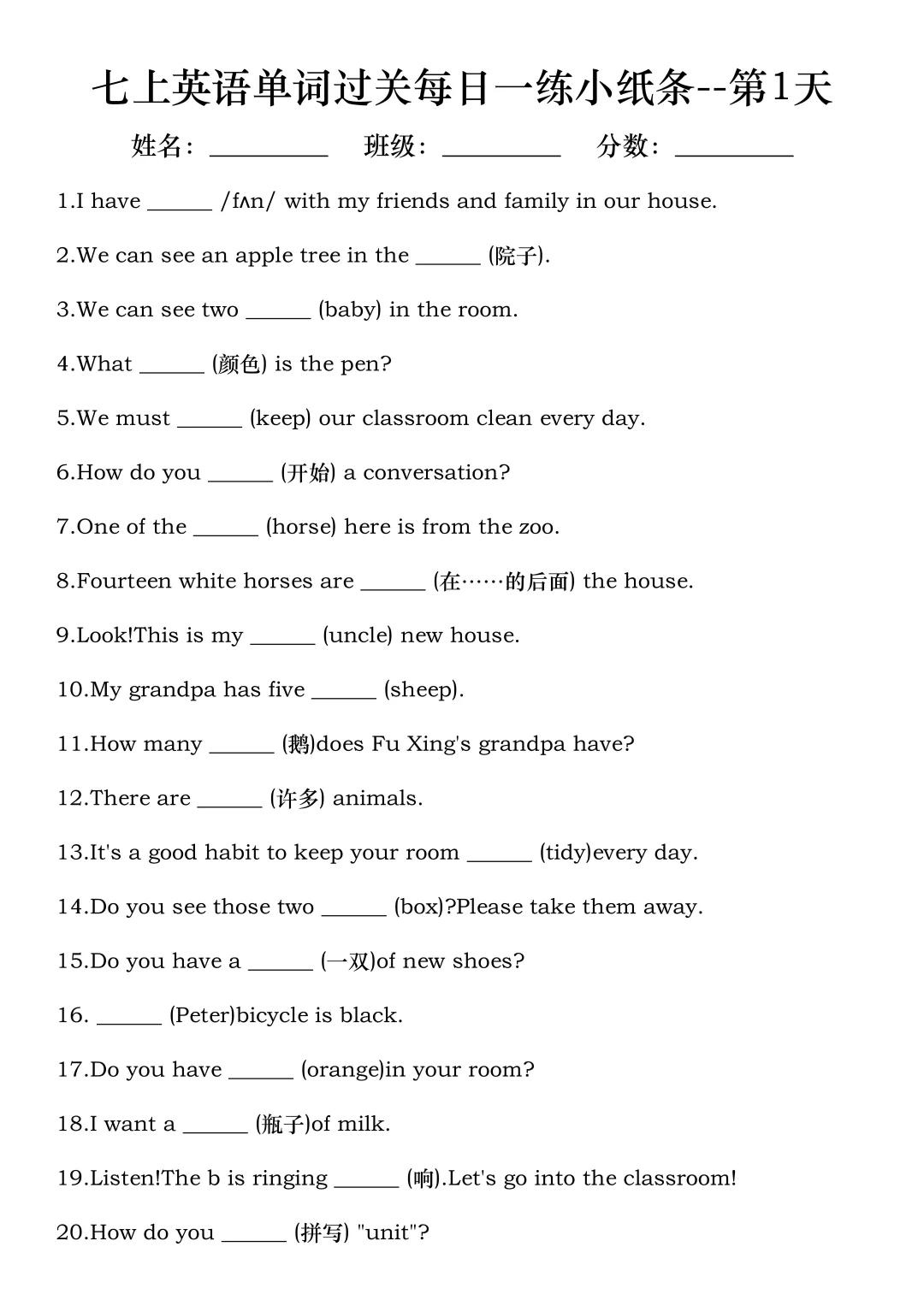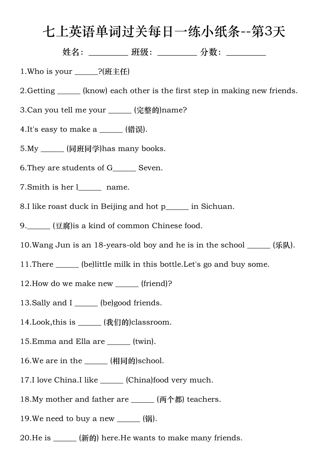火箭班老师发的:七上英语每日一练小纸条