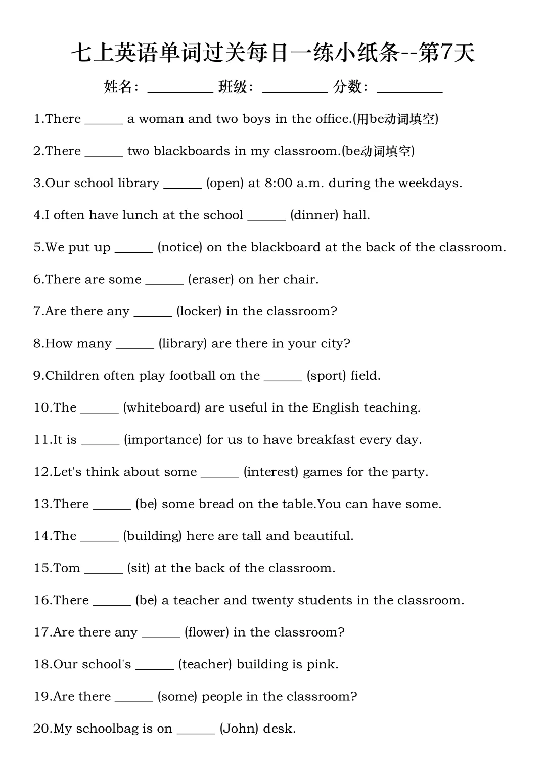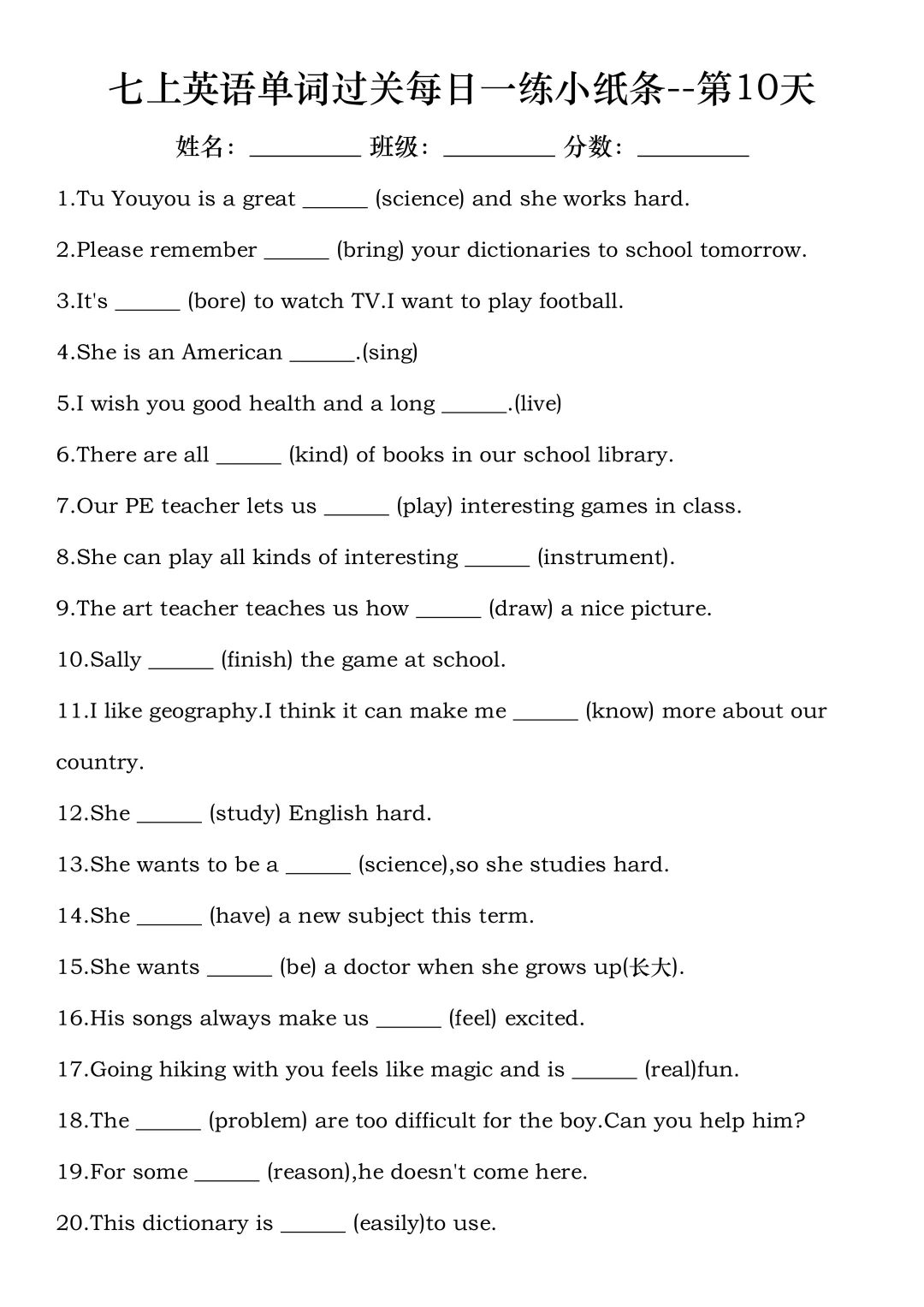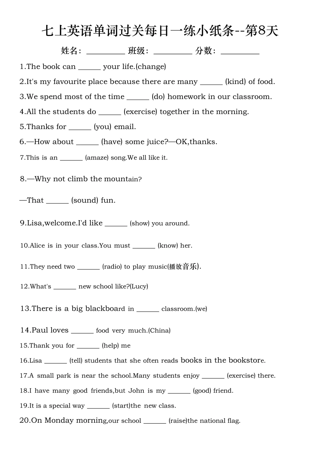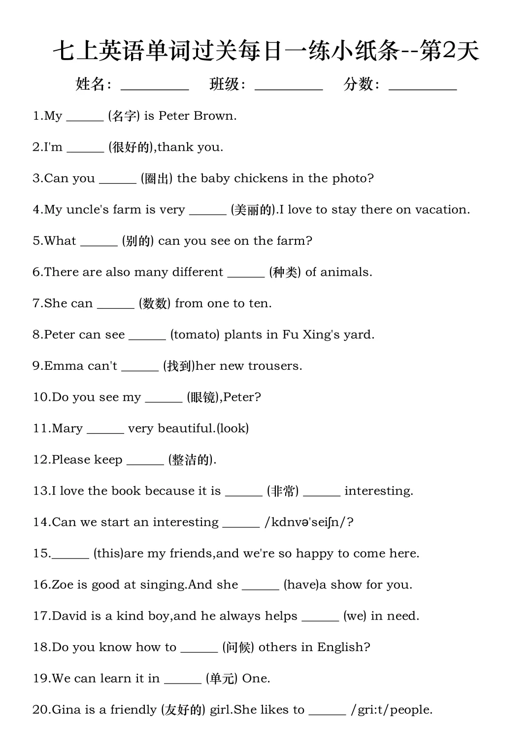 火箭班老师发的:七上英语每日一练小纸条